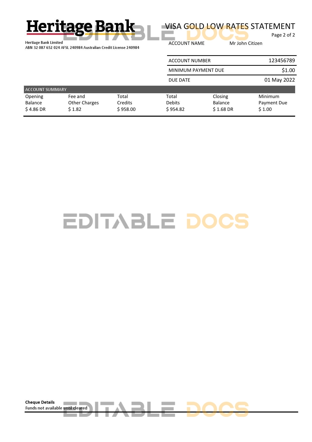 Australia Heritage bank statement Word template