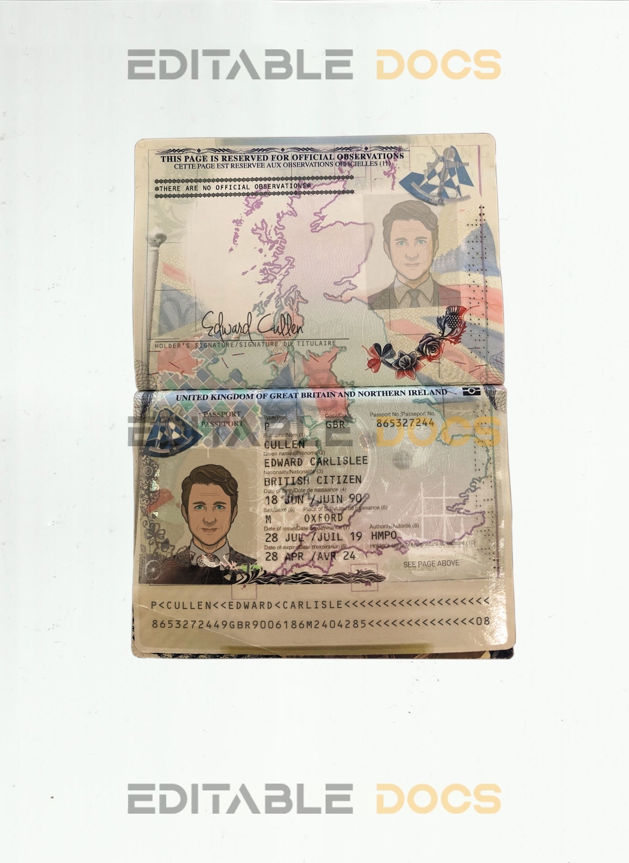 Authentic Customizable United Kingdom of Great Britain and Northern Ireland PSD Passport Template