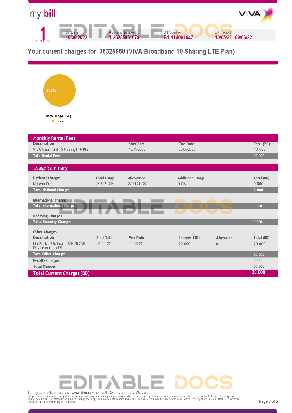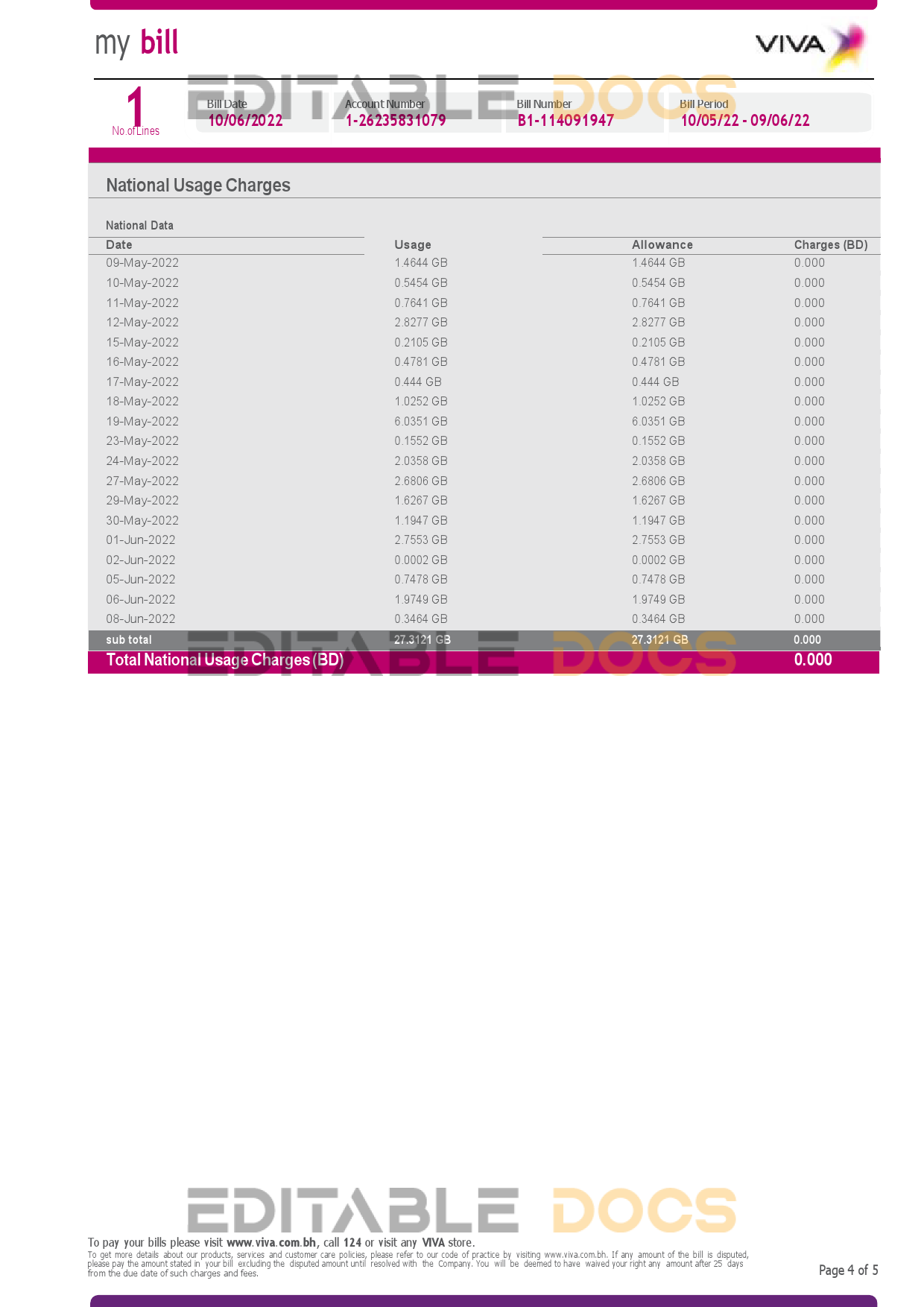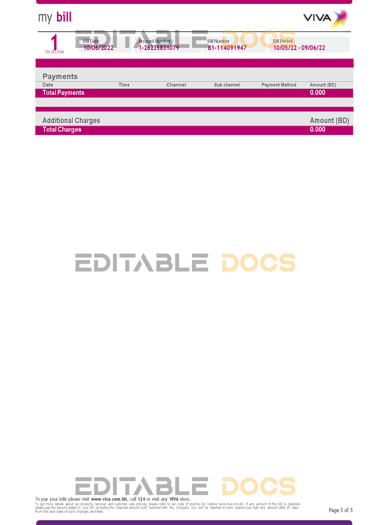 Bahrain Viva my utility bill Word and Pdf Template used for: