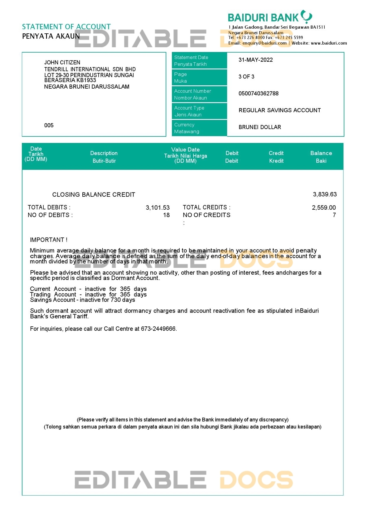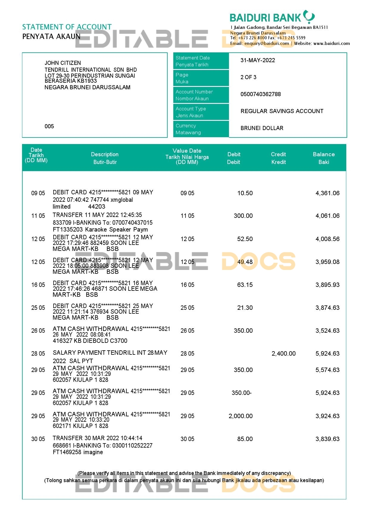 Brunei Baiduri bank statement Word and Pdf Template use for :