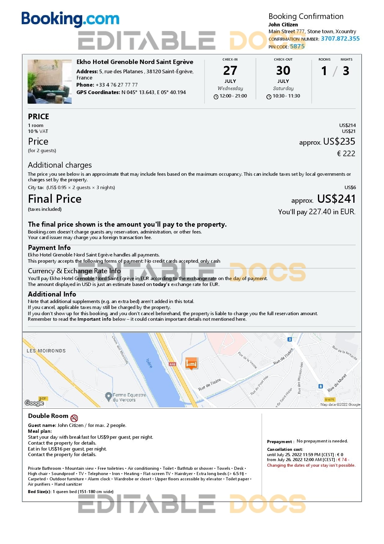 Are you in need of a hotel or Airbnb booking confirmation for your needs? Look no further! Mr. Verify’s editable templates are perfect for providing proof of accommodation and showing expenses, making the fake booking process even more authentic and reliable. Our templates come in both Word and PDF formats, and are available for almost all countries. With our France country name fillable booking form templates, you can easily customize your booking confirmation to fit your specific needs, saving you time and hassle. And if you need any help with editing or construction works, our specialists are ready to assist you at affordable prices. Our support team is also available online to answer any questions you may have.