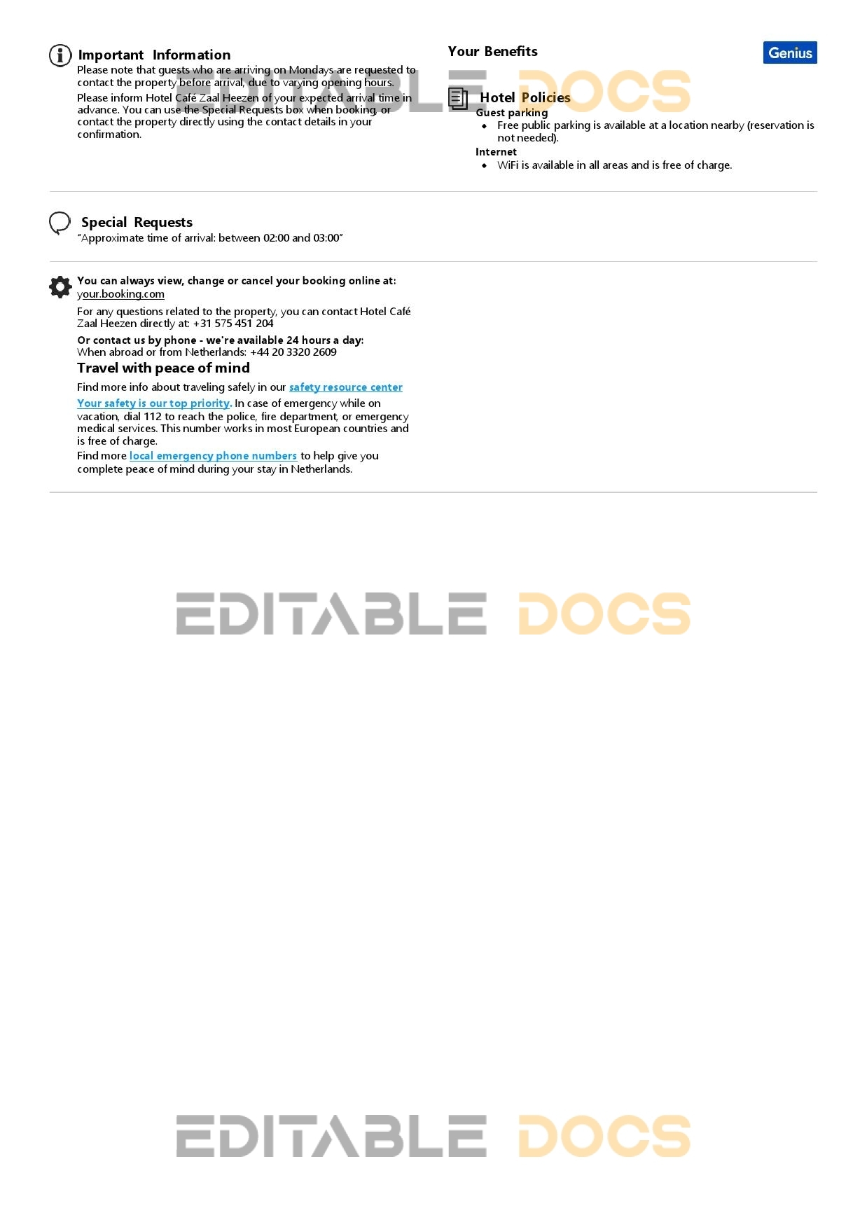 Are you in need of a hotel or Airbnb booking confirmation for your needs? Look no further! Mr. Verify’s editable templates are perfect for providing proof of accommodation and showing expenses, making the fake booking process even more authentic and reliable. Our templates come in both Word and PDF formats, and are available for almost all countries. With our Netherlands country name fillable booking form templates, you can easily customize your booking confirmation to fit your specific needs, saving you time and hassle. And if you need any help with editing or construction works, our specialists are ready to assist you at affordable prices. Our support team is also available online to answer any questions you may have.