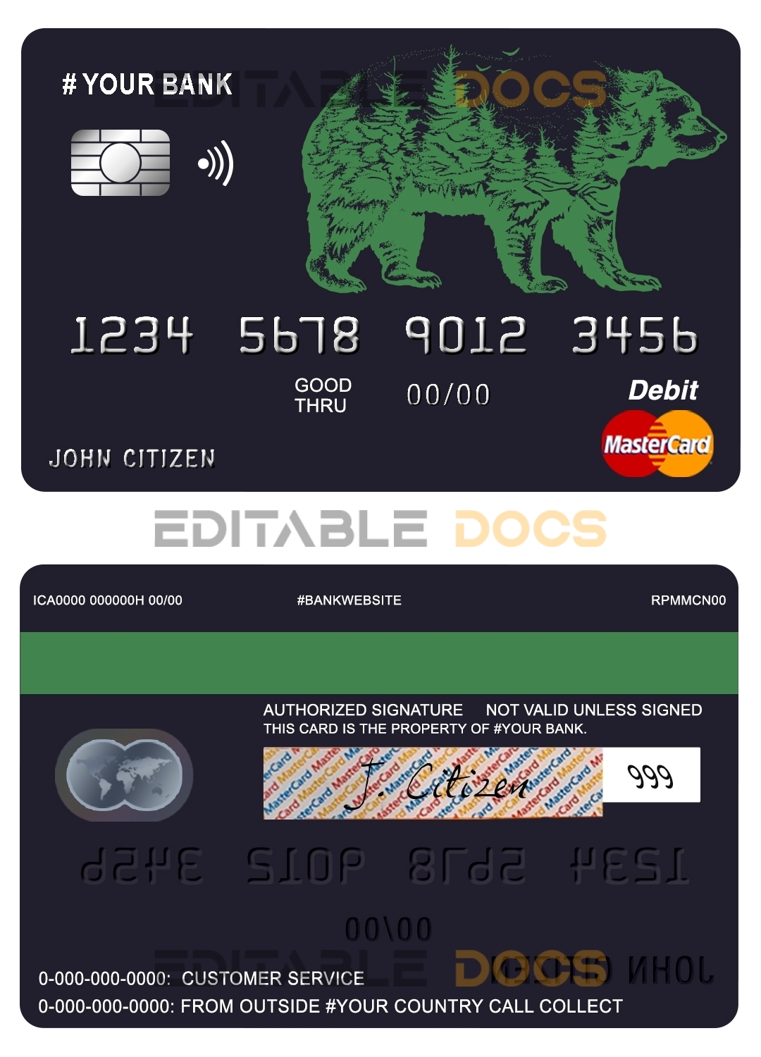 Our alpine bear universal multipurpose bank mastercard debit credit card templates are user-friendly and come with well-organized layers, making customization a hassle-free process for both designers and non-designers. With our templates, you can create custom mastercard debit credit cards that suit your needs and preferences, without the need for advanced design skills or software.