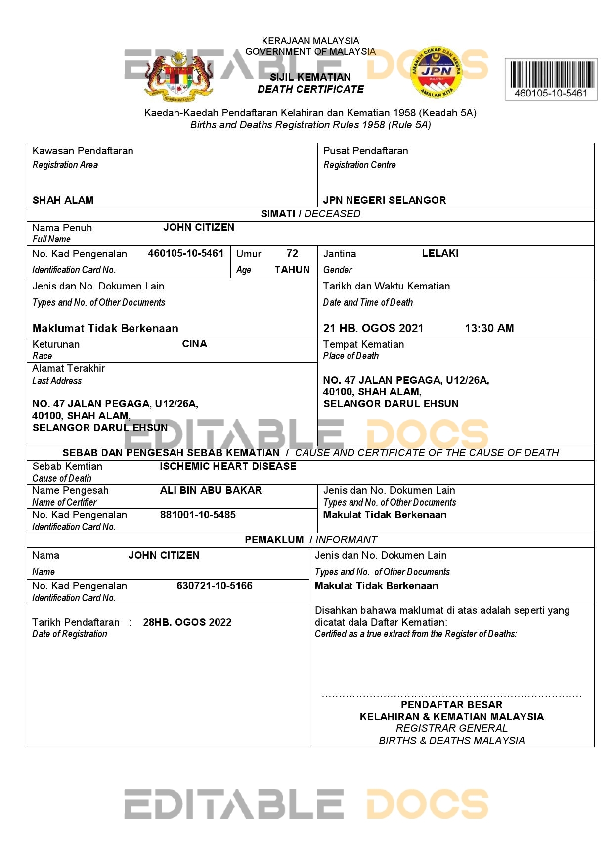 Fillable Malaysia Death PDF Templates | Blank Docs