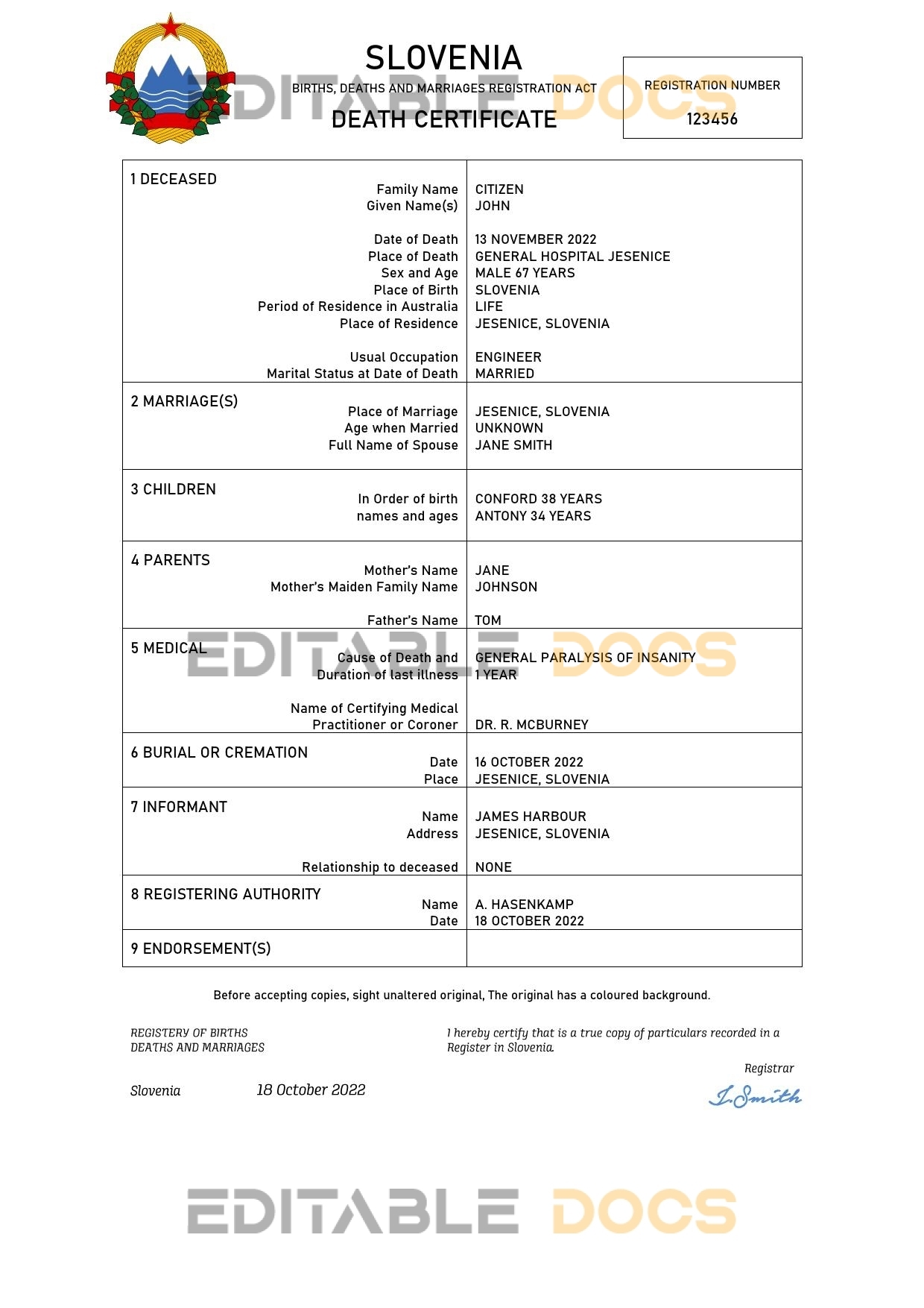 Welcome to EditableDocs.cc, your go-to destination for customizable death certificate templates in Microsoft Office Word (.docs) format. Our wide selection of death certificate templates from countries around the world allows you to effortlessly create authentic-looking documents. Whether you need death certificates for entertainment purposes, movie production, or educational projects, our templates are designed to add realism and convenience to your creative endeavors.