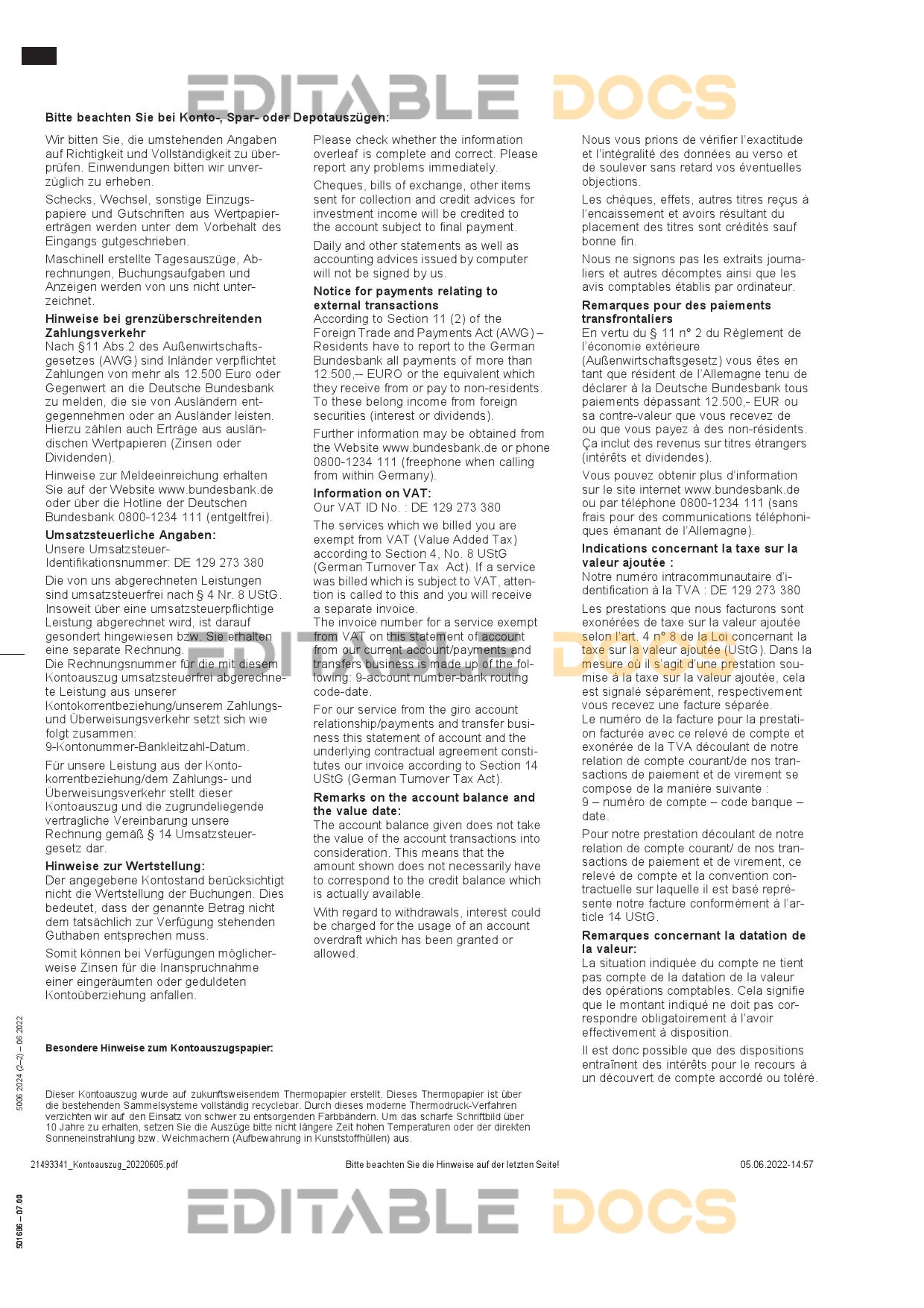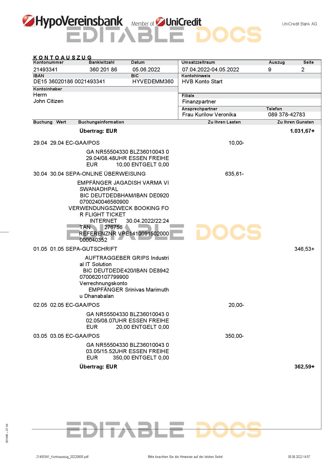 Germany HypoVereins bank statement Word template . Fully editable Word template. High quality template. Easy to customize, Layer based, fonts included. you can edit this template and put any name, address, license number, Id number, birth date, height, weight, expire date, change photos etc. This Word template is a easy to Editing.To modify this Word template file you will need a Word editing software such as Microsoft Word. Never used low quality template. Your account may be suspended.