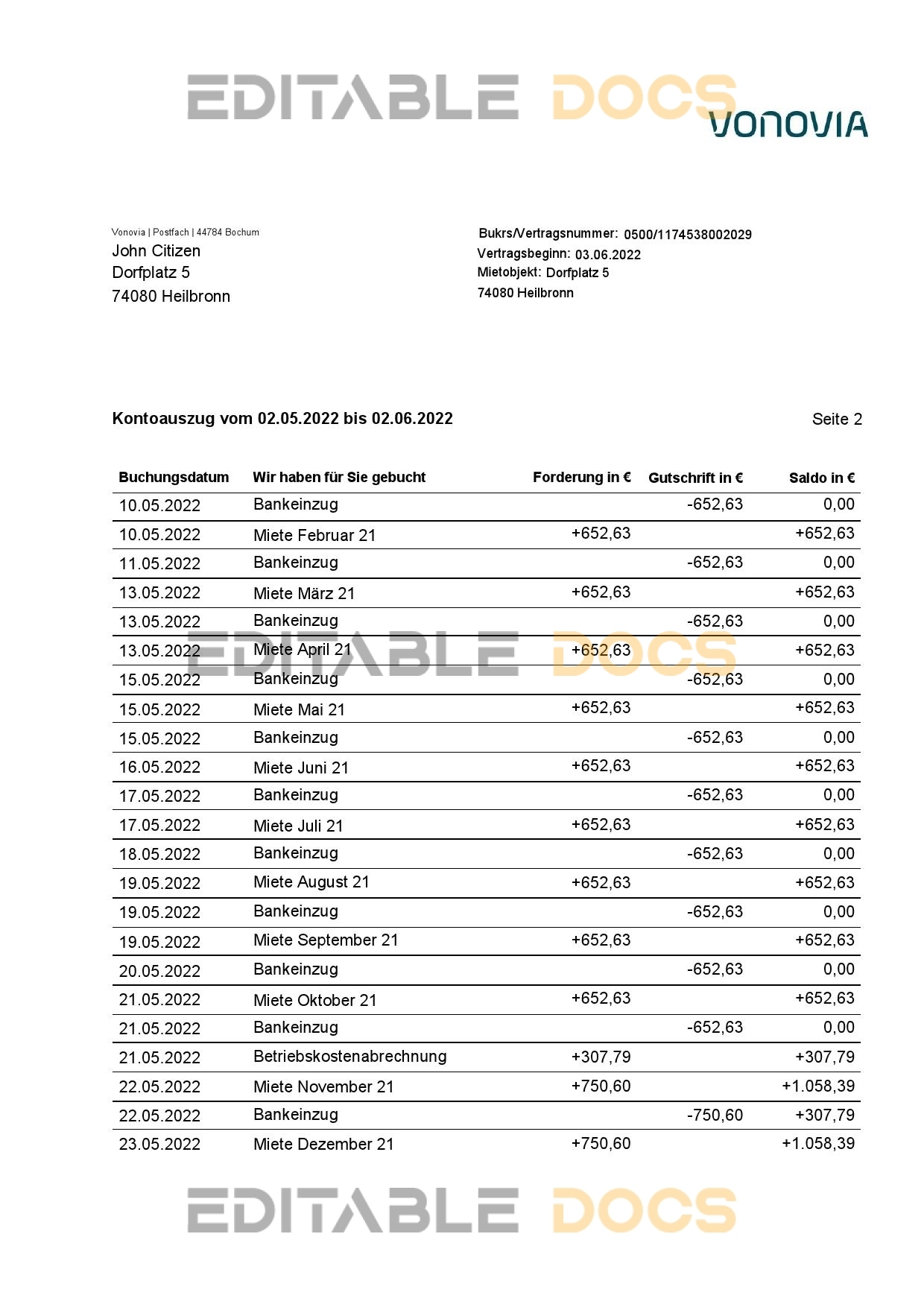 Grab now fully editable Germany Vonovia bank statement Word Template from our website Fake Docs and put your own info to create Fake Bank Statement Word template and ready your own novelty documents. It’ll be so beneficial if your Bank Statement is expired, stolen or not available. We also have passport psd template, ID Card psd template, Bank Statement psd template, drivers license psd template & Utility bill psd template