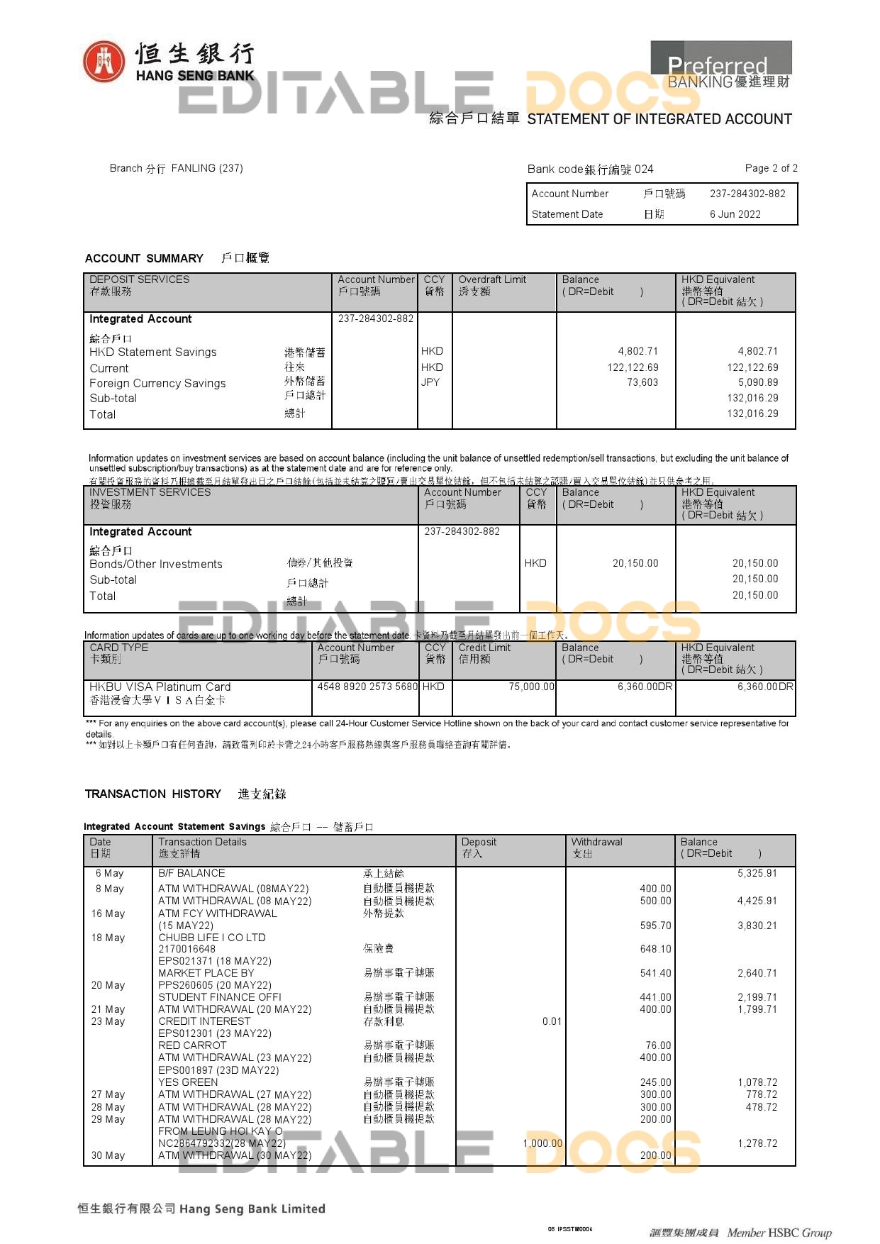 Hong Kong Hang Seng bank statement Word template . Fully editable Word template. High quality template. Easy to customize, Layer based, fonts included. you can edit this template and put any name, address, license number, Id number, birth date, height, weight, expire date, change photos etc. This Word template is a easy to Editing.To modify this Word template file you will need a Word editing software such as Microsoft Word. Never used low quality template. Your account may be suspended.