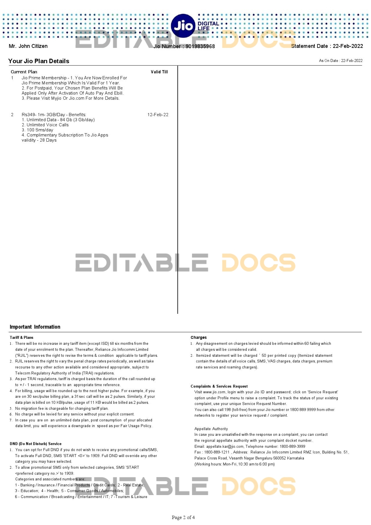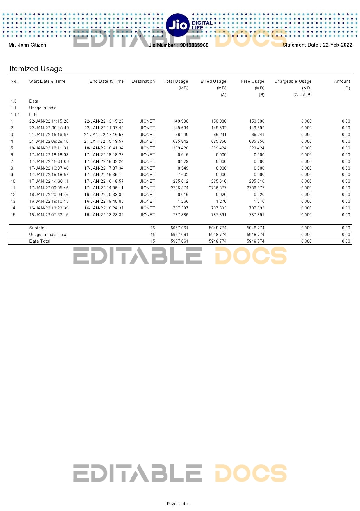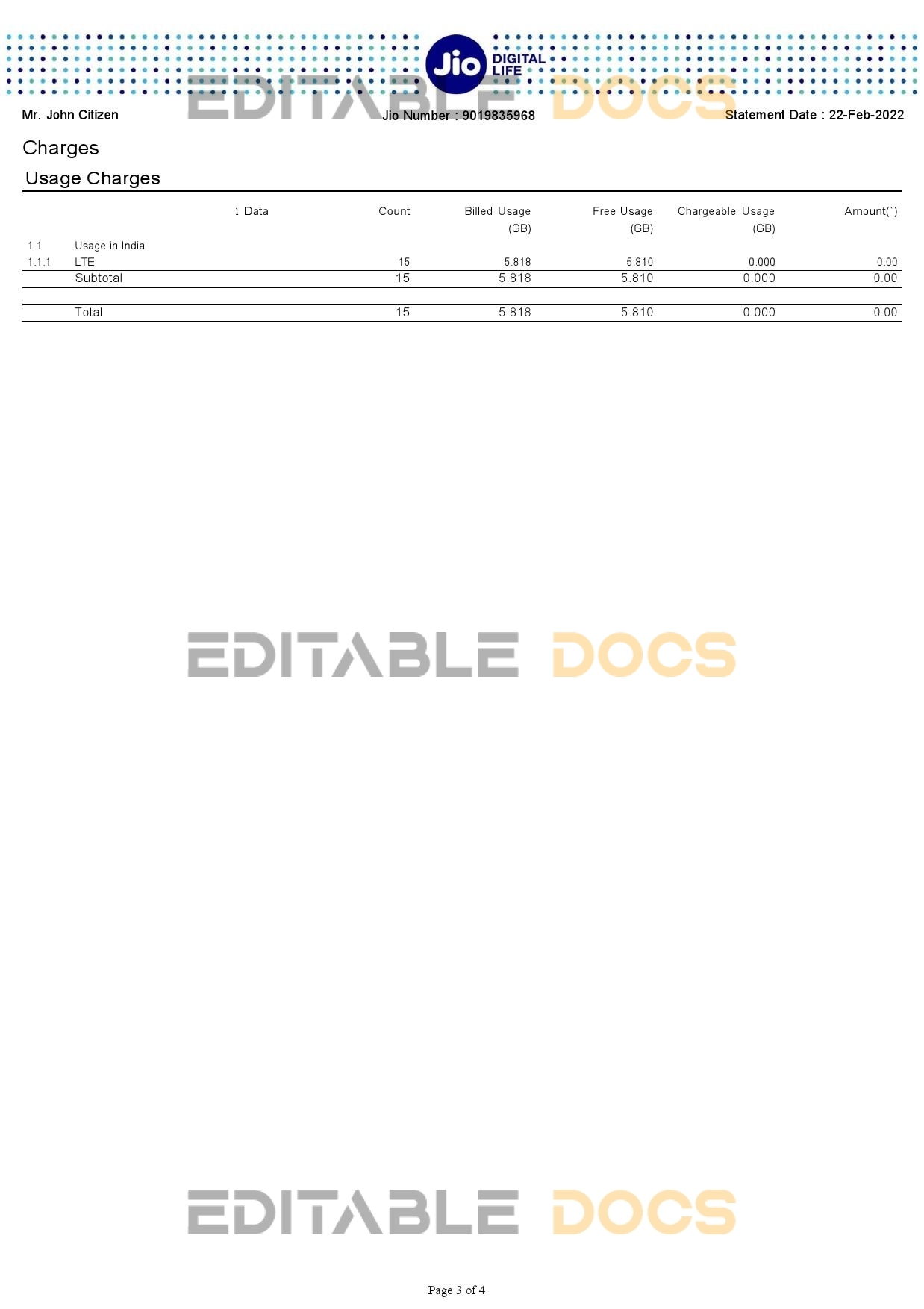 India Jio Digital Life bank statement reliable Word template