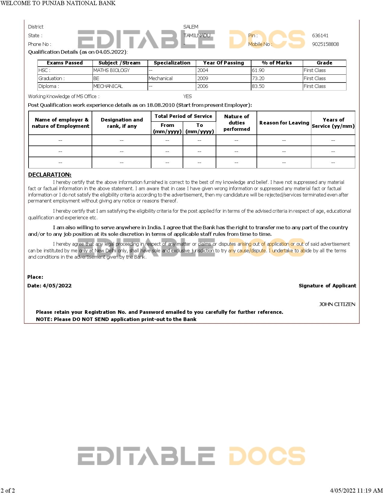 India Punjab National Bank statement reliable Word template