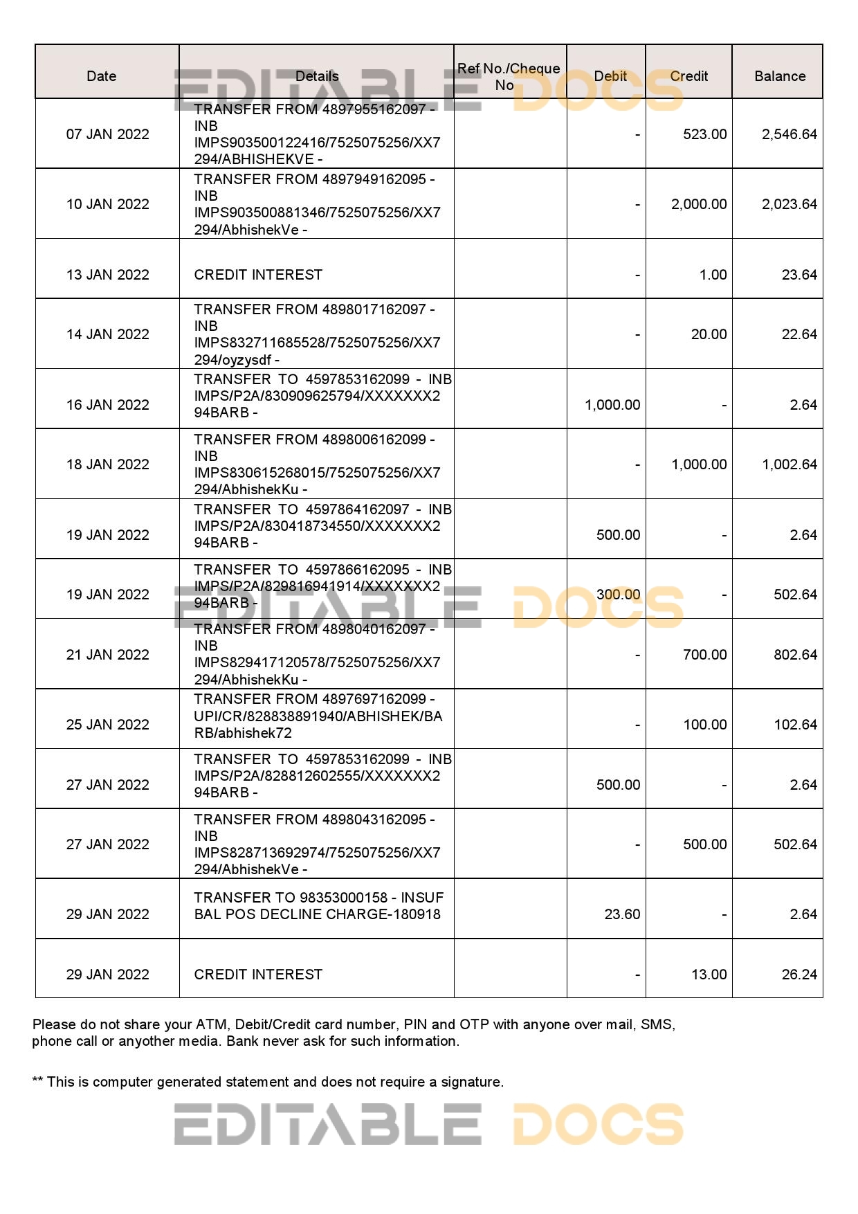 India State Bank of India (SBI) bank statement Word and Pdf Template use for :