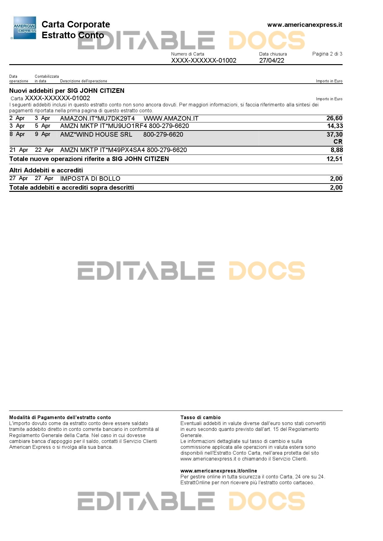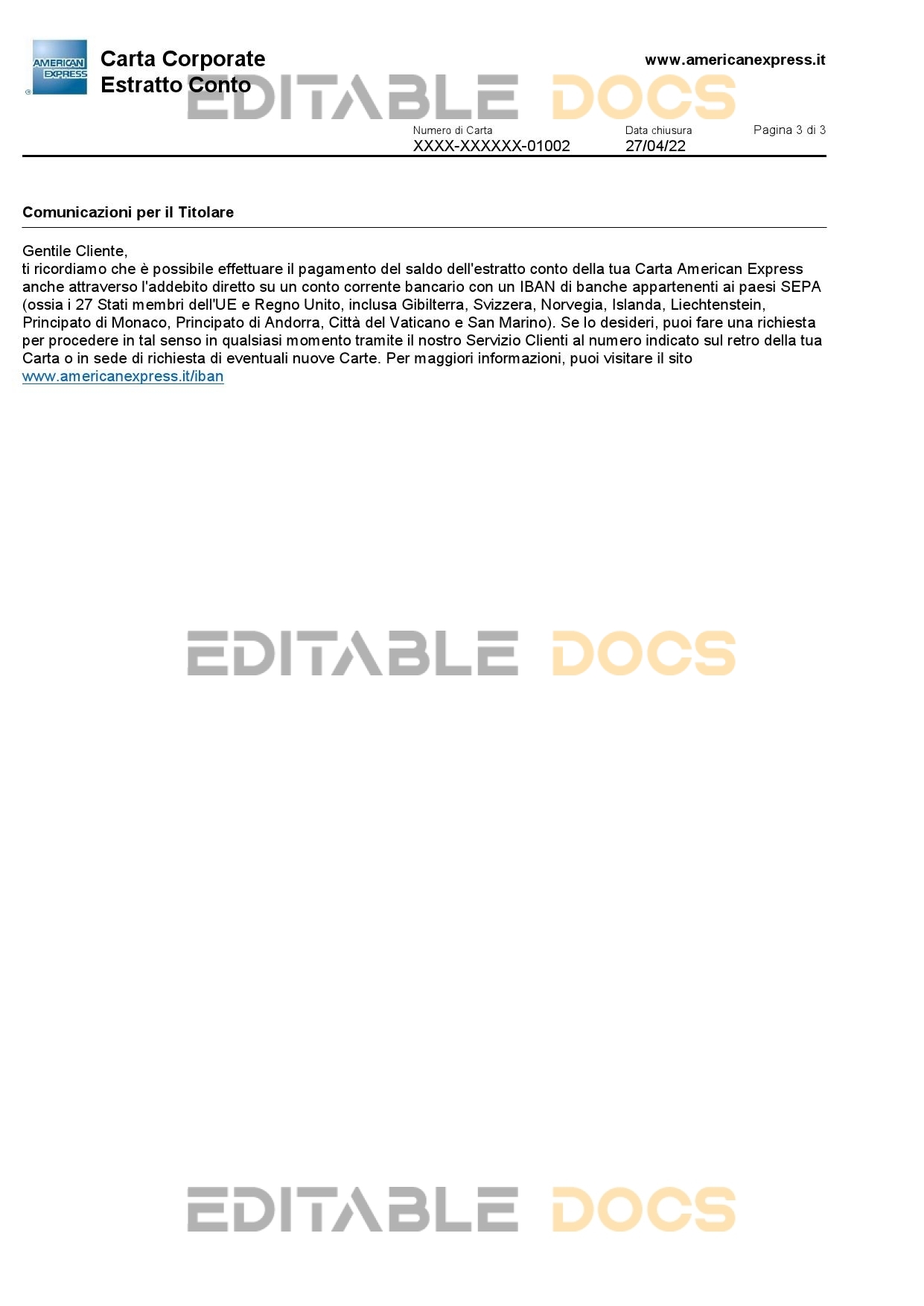 Italy American Express Amex bank card statement reliable Word template