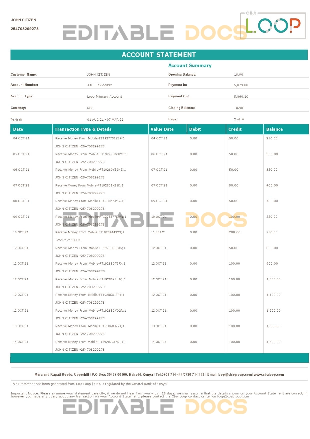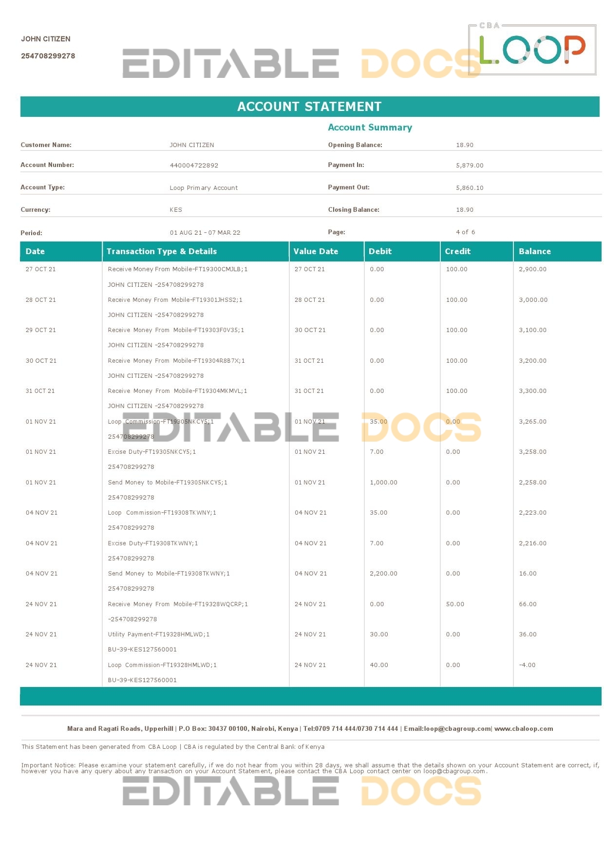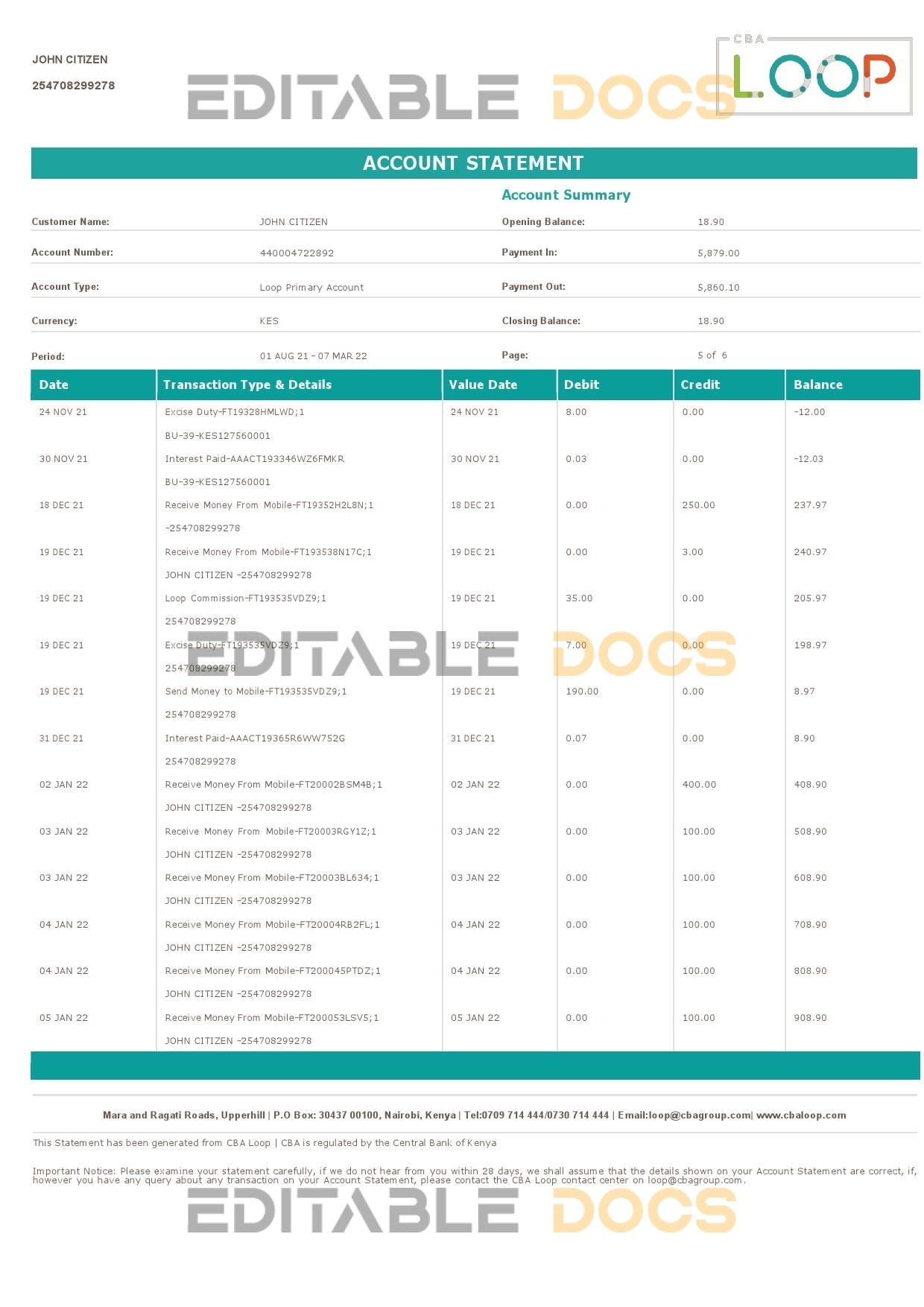 Once you make your purchase, you’ll be able to immediately download the Kenya CBA Loop bank statement.doc file and fonts.