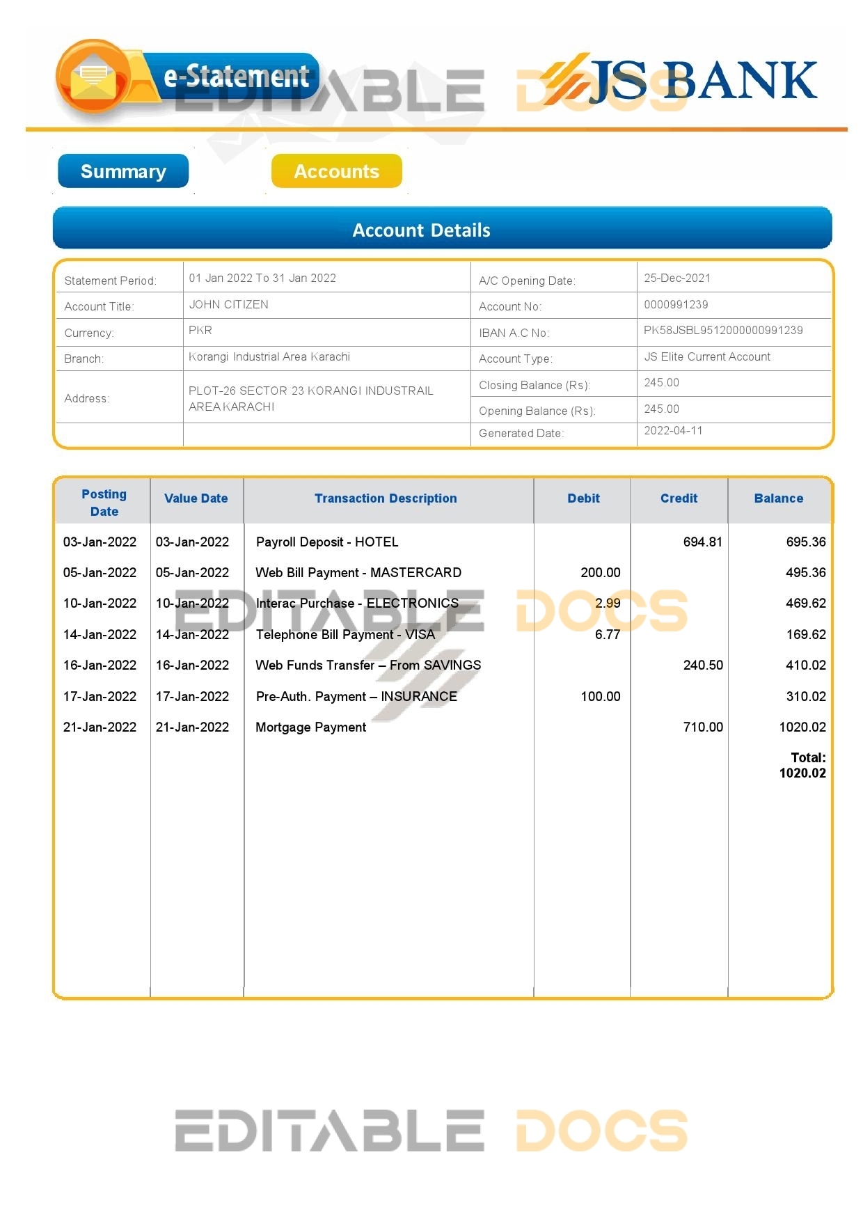 Once you make your purchase, you’ll be able to immediately download the Pakistan JS bank e-statement.doc file and fonts.