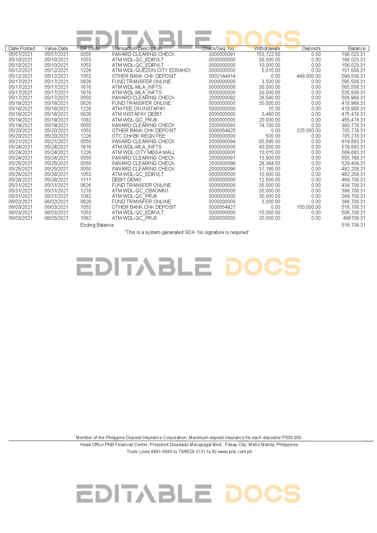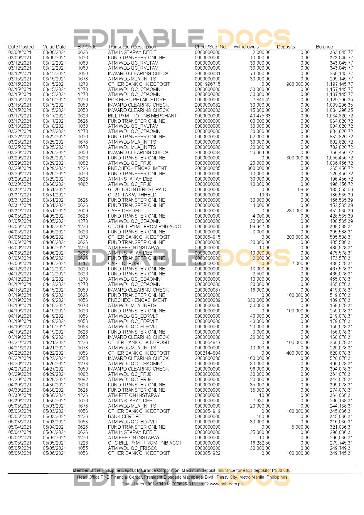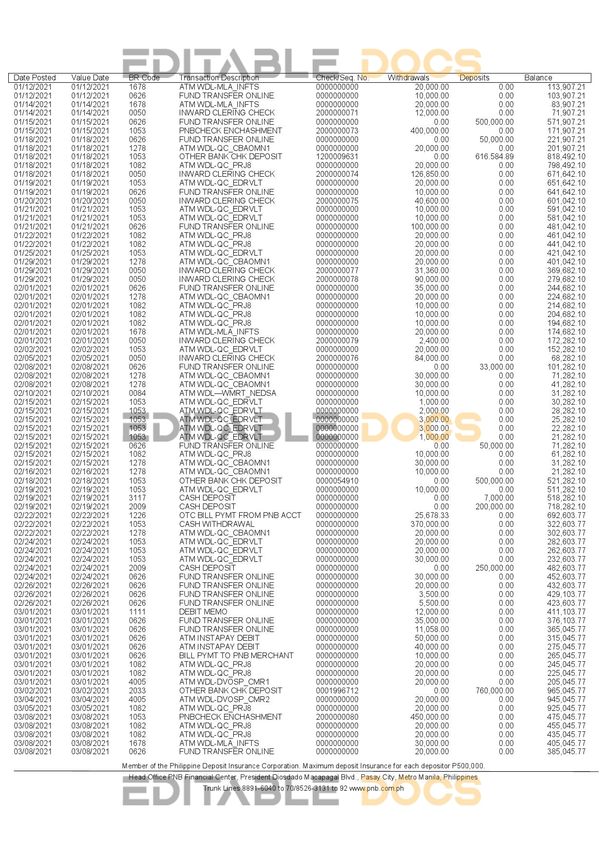 Philippines PNB bank statement Word template