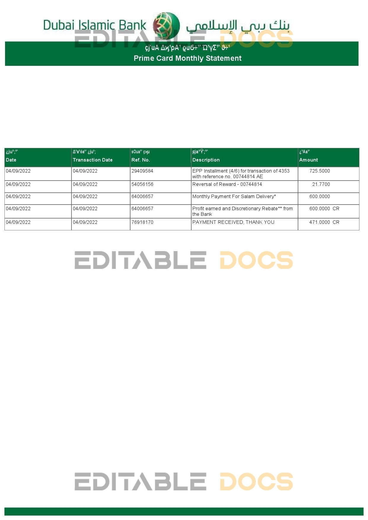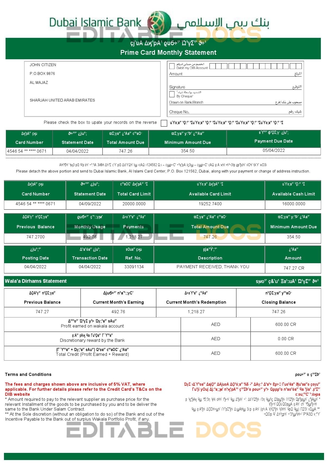 Once you make your purchase, you’ll be able to immediately download the UAE Dubai Islamic bank statement.doc file and fonts.