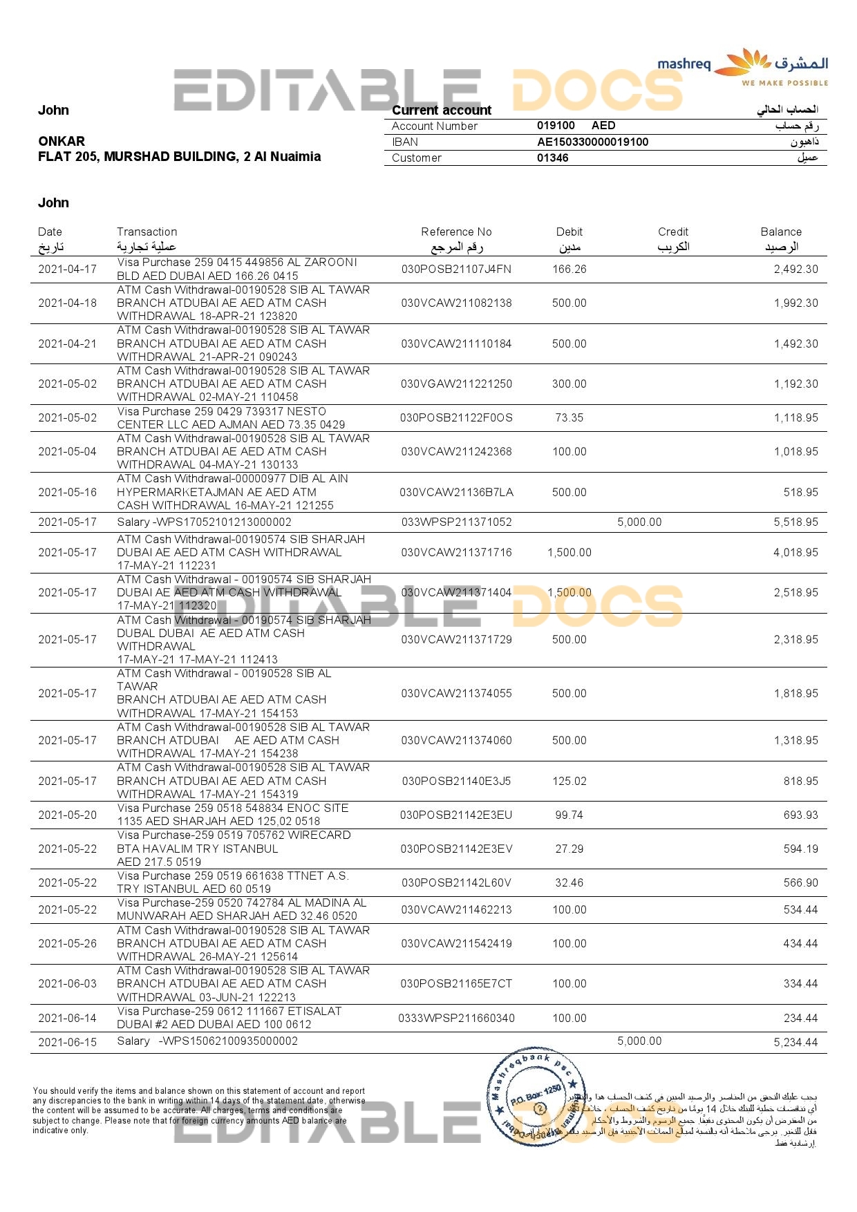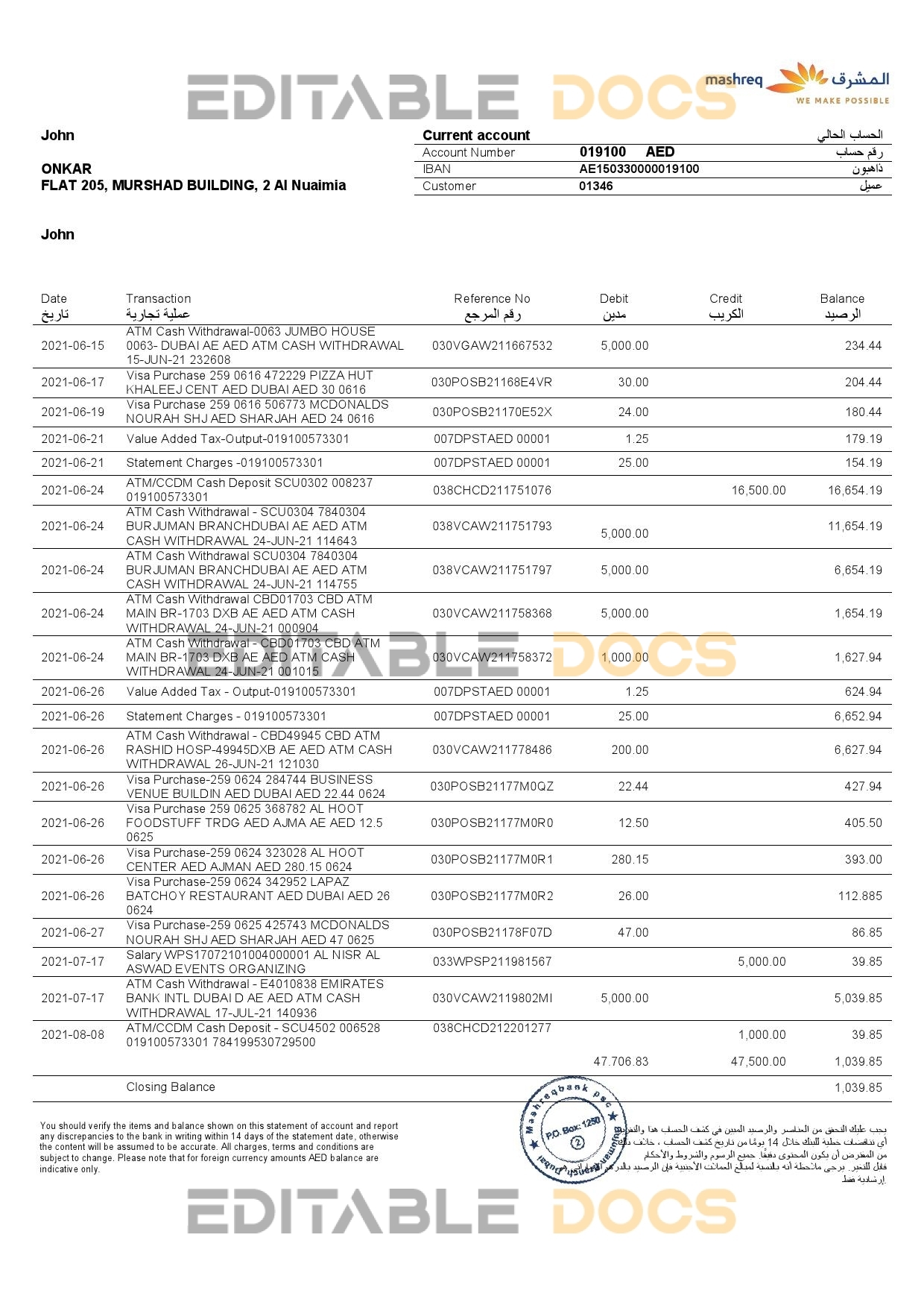 UAE Mashreq bank statement Word template . Fully editable Word template. High quality template. Easy to customize, Layer based, fonts included. you can edit this template and put any name, address, license number, Id number, birth date, height, weight, expire date, change photos etc. This Word template is a easy to Editing.To modify this Word template file you will need a Word editing software such as Microsoft Word. Never used low quality template. Your account may be suspended.