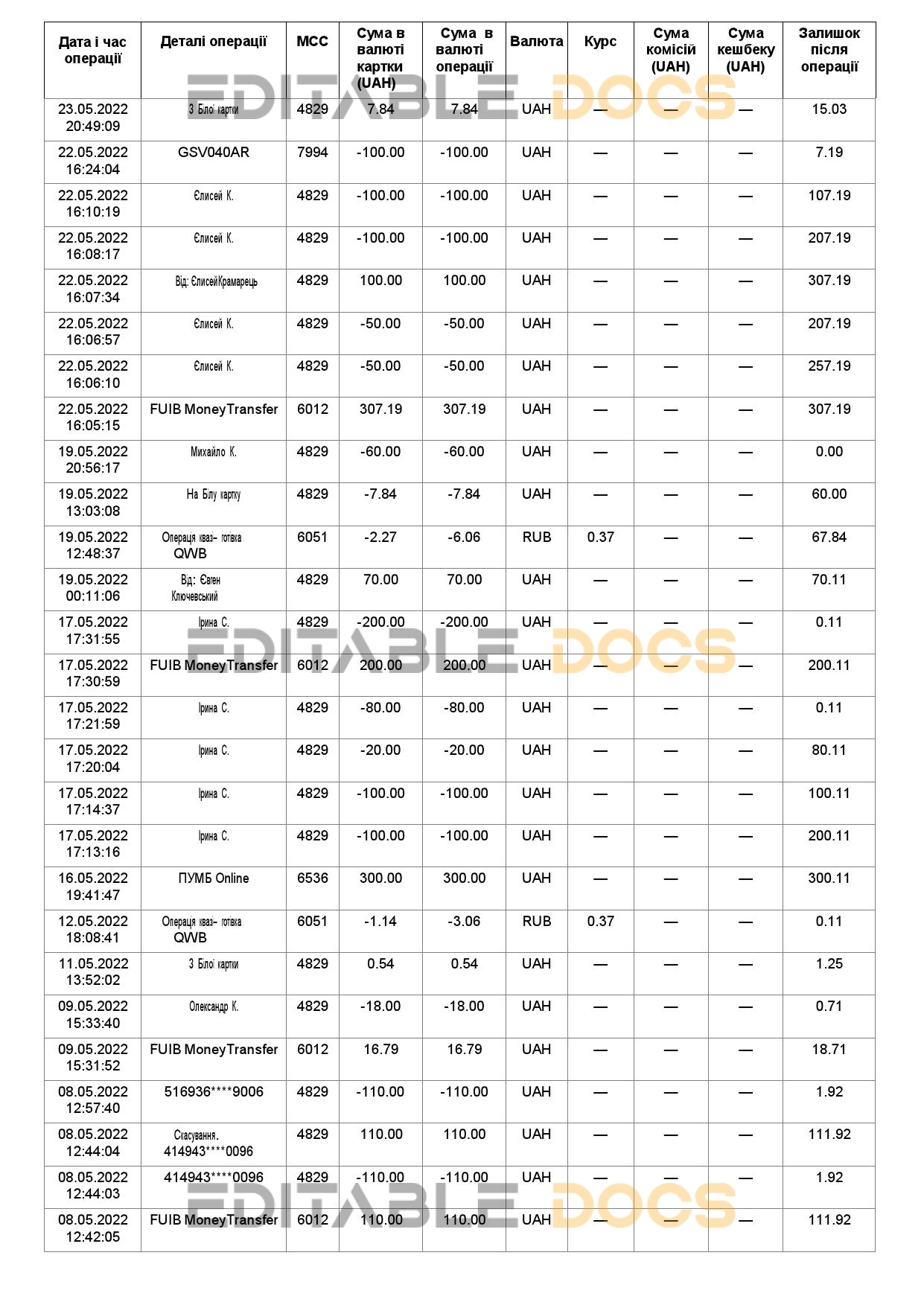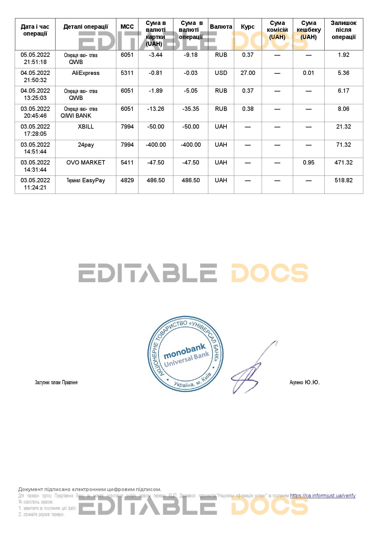 Ukraine Monobank bank statement Word and Pdf Template use for :