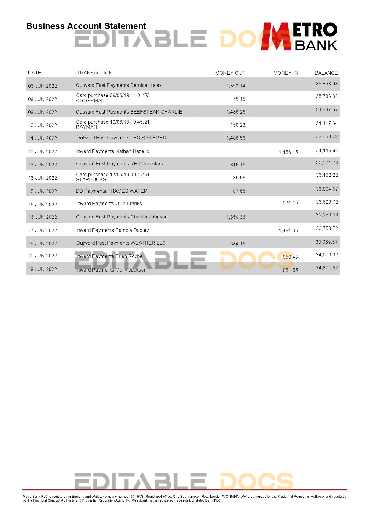 United Kingdom Metro bank business account statement Word template