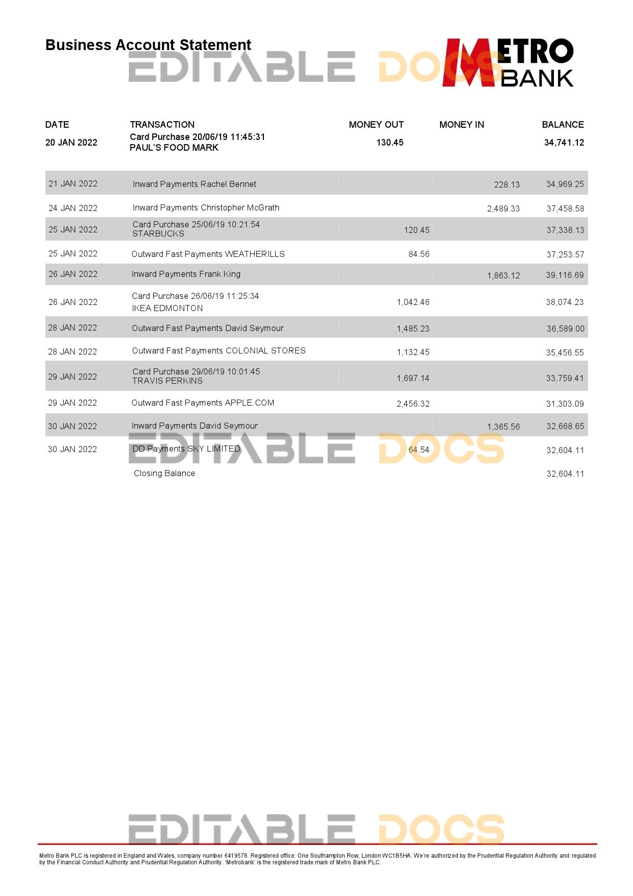 United Kingdom Metro bank business account statement Word and Pdf Template use for :