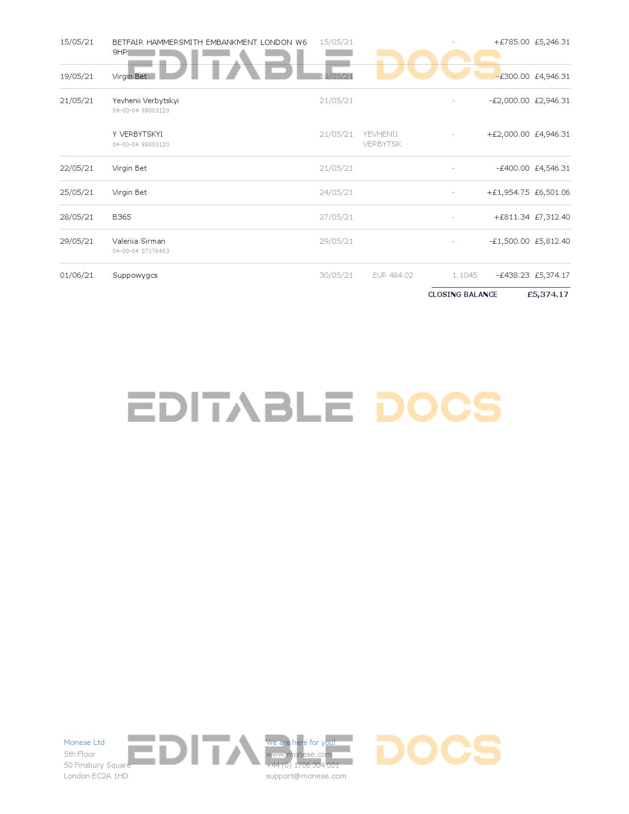 United Kingdom Monese bank statement reliable Word template