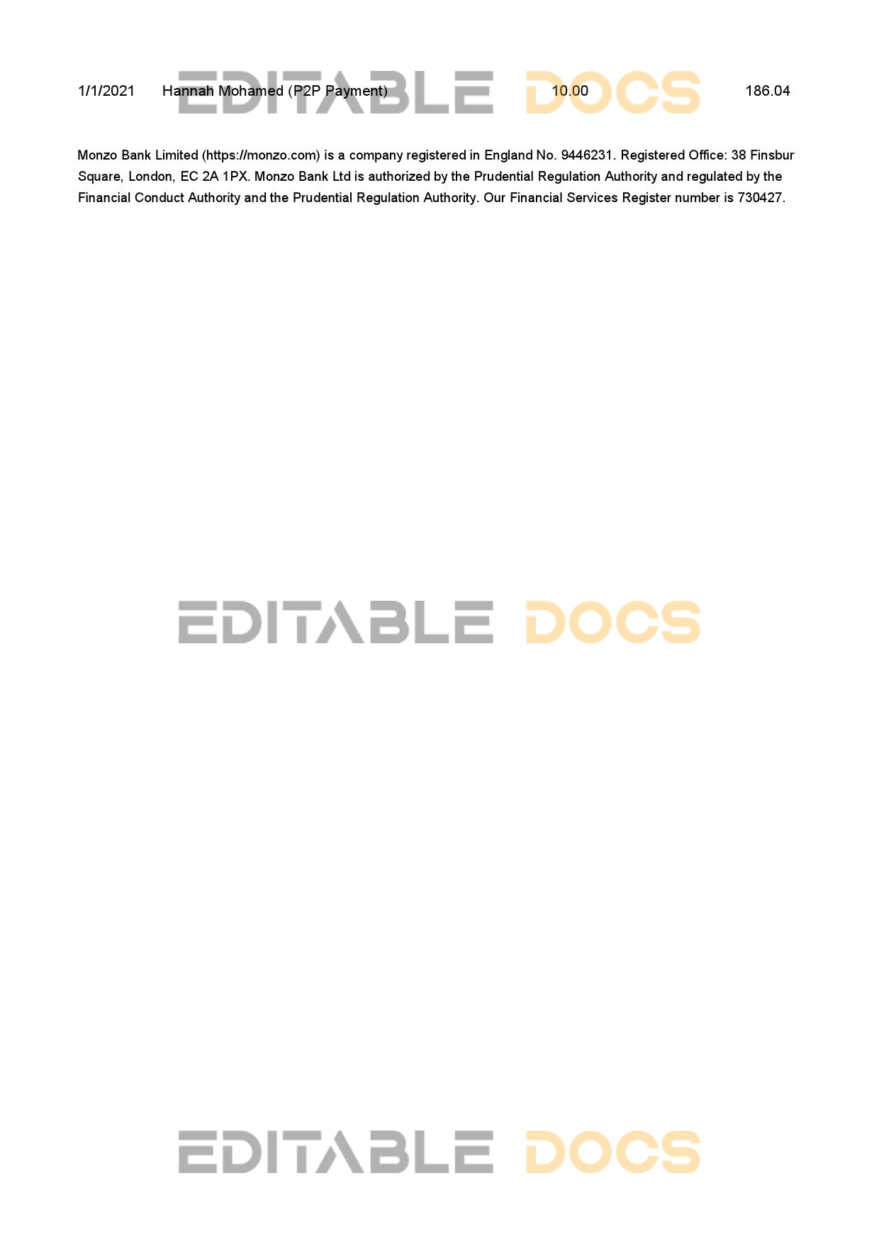 Editable-docs offers a United Kingdom Monzo bank statement Microsoft excel template that can be easily modified and customized. All the necessary elements can be altered, such as a person’s name, address, ID number, birth date, height, weight, and expiration date, as well as images. This template is of a high-quality and is layer-based, so it is compatible with Microsoft excel editing software. Be cautious! Avoid low-quality free templates because they might lead to an account suspension.