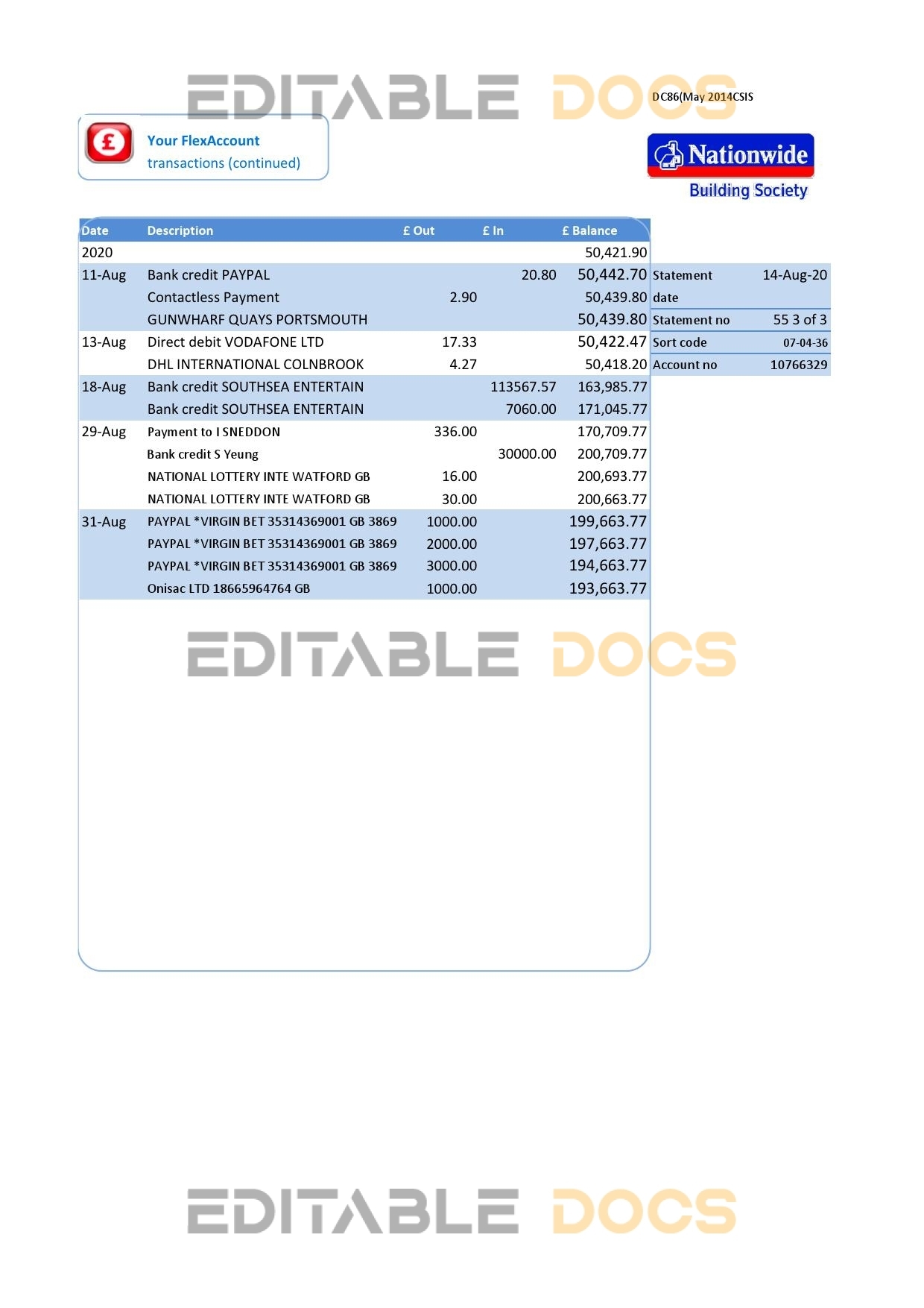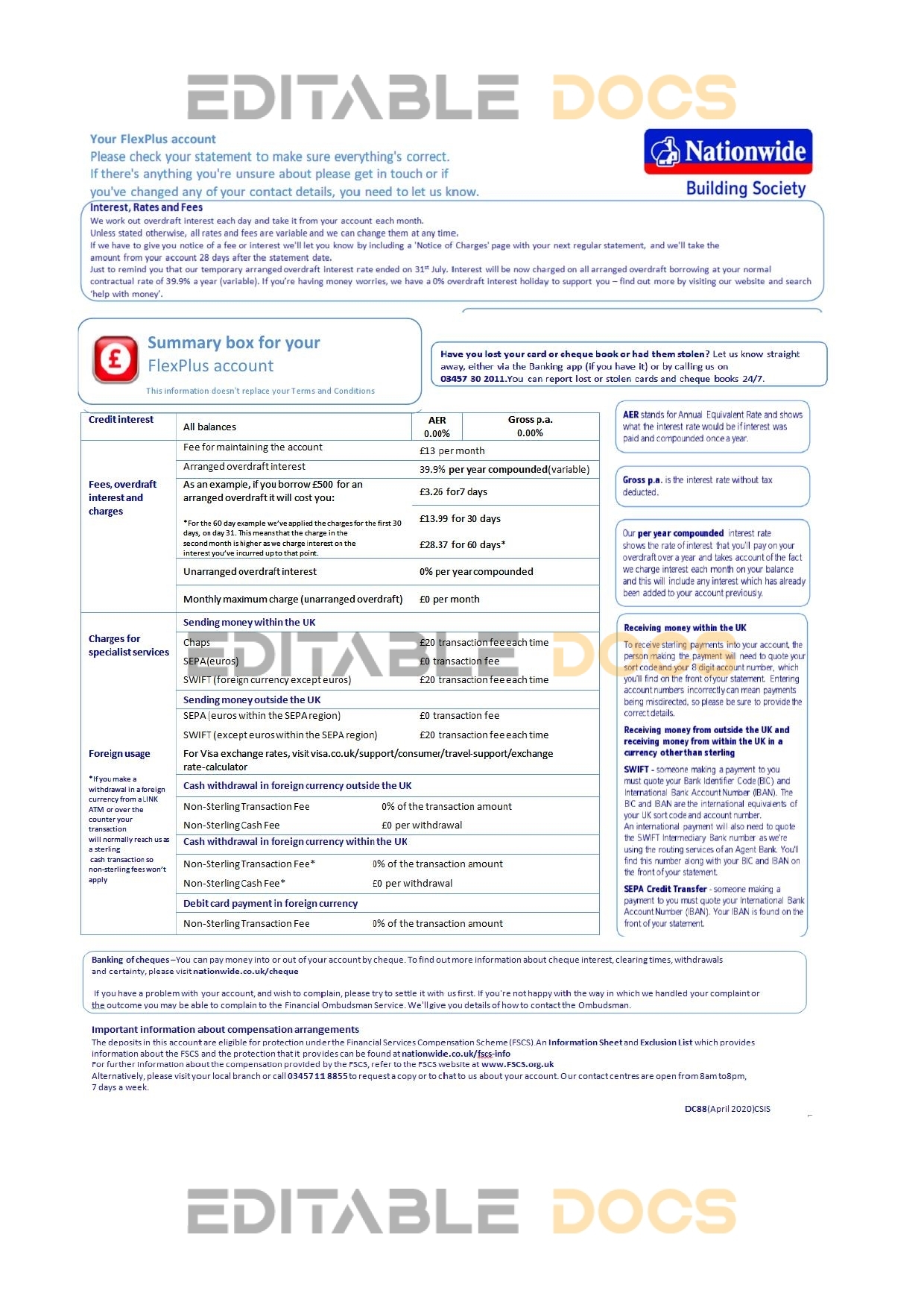 Editable-docs offers a United Kingdom Nationwide bank statement Microsoft excel template that can be easily modified and customized. All the necessary elements can be altered, such as a person’s name, address, ID number, birth date, height, weight, and expiration date, as well as images. This template is of a high-quality and is layer-based, so it is compatible with Microsoft excel editing software. Be cautious! Avoid low-quality free templates because they might lead to an account suspension.