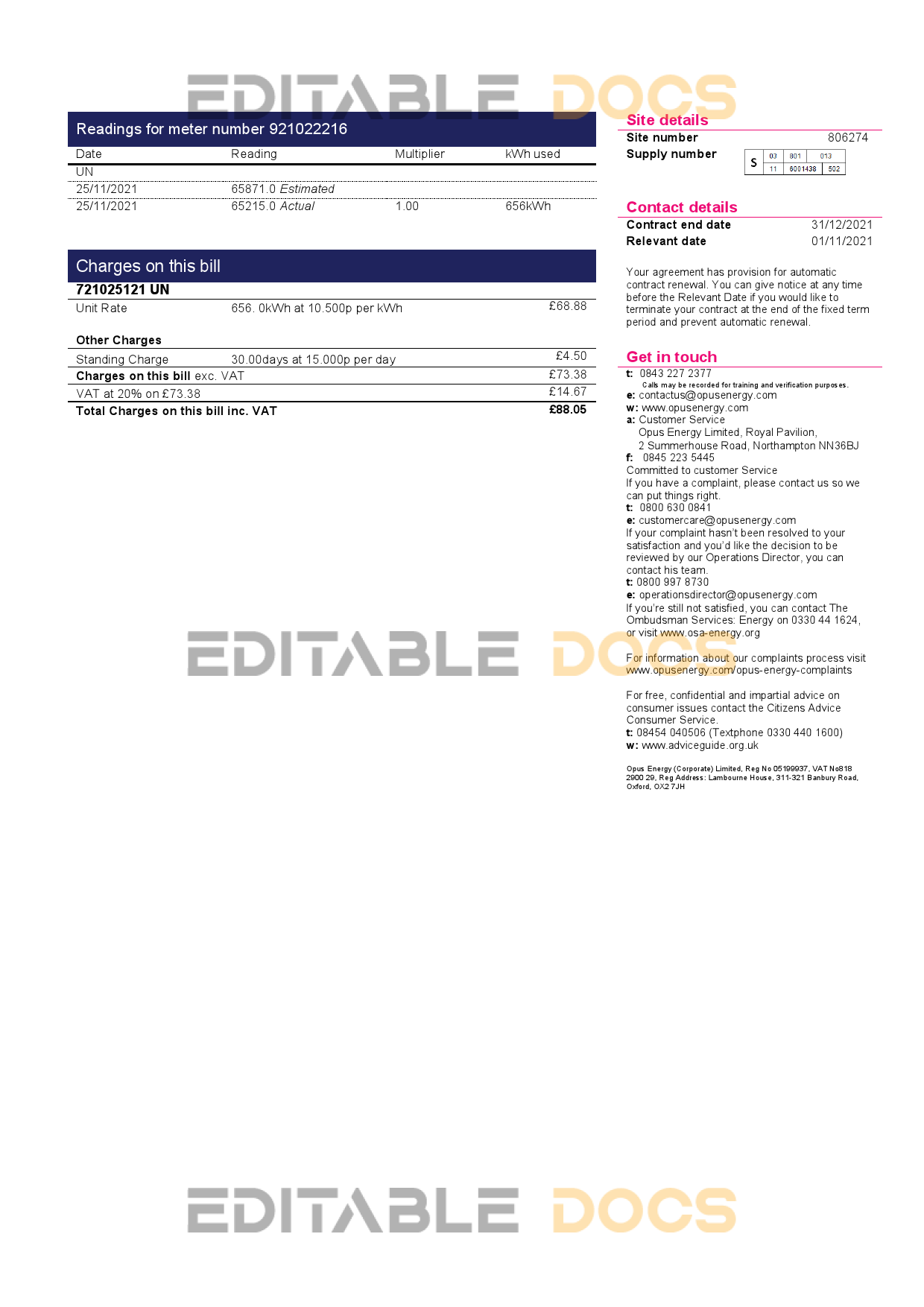United Kingdom Opus Energy electricity utility bill Word and Pdf Template used for: