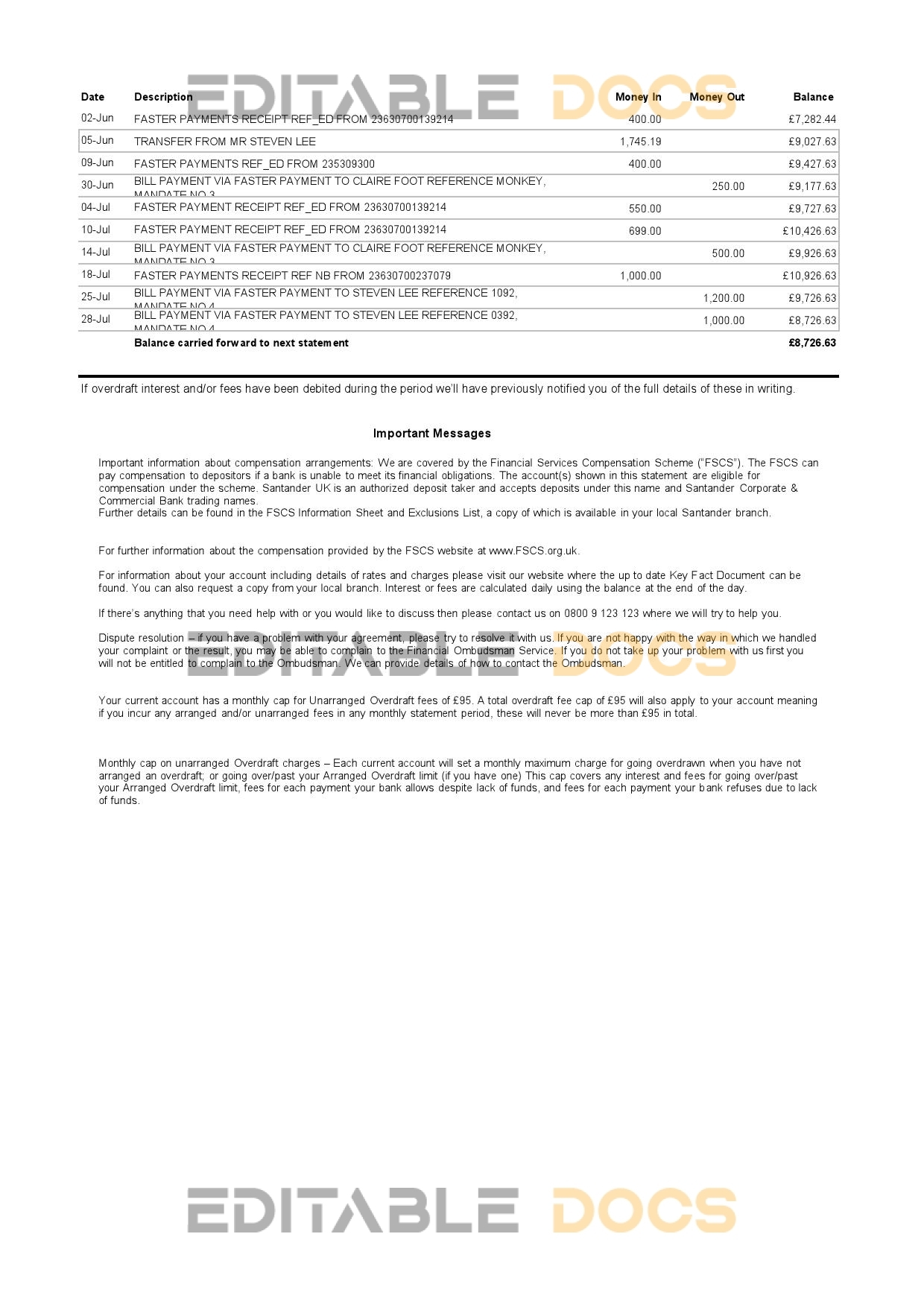 United Kingdom Santander bank statement Template in Excel an PDF format use for :
