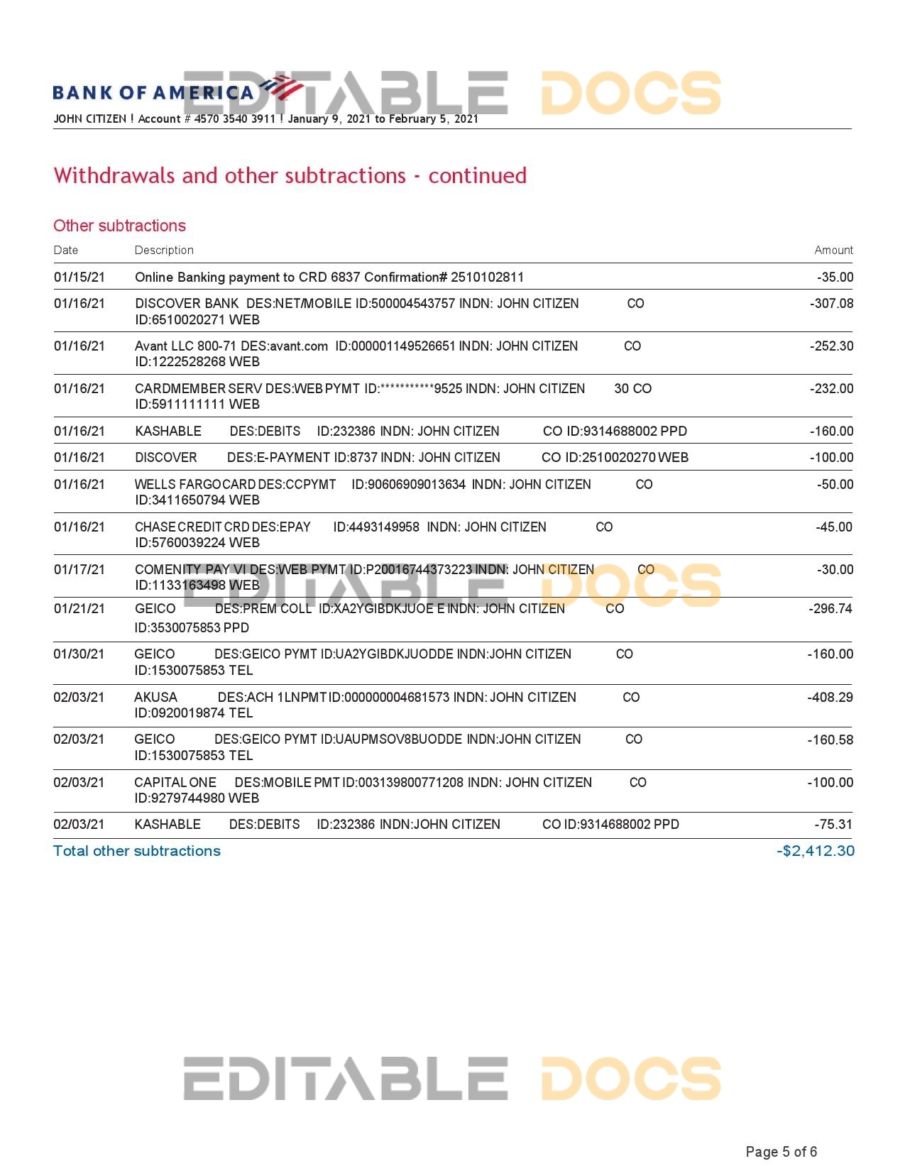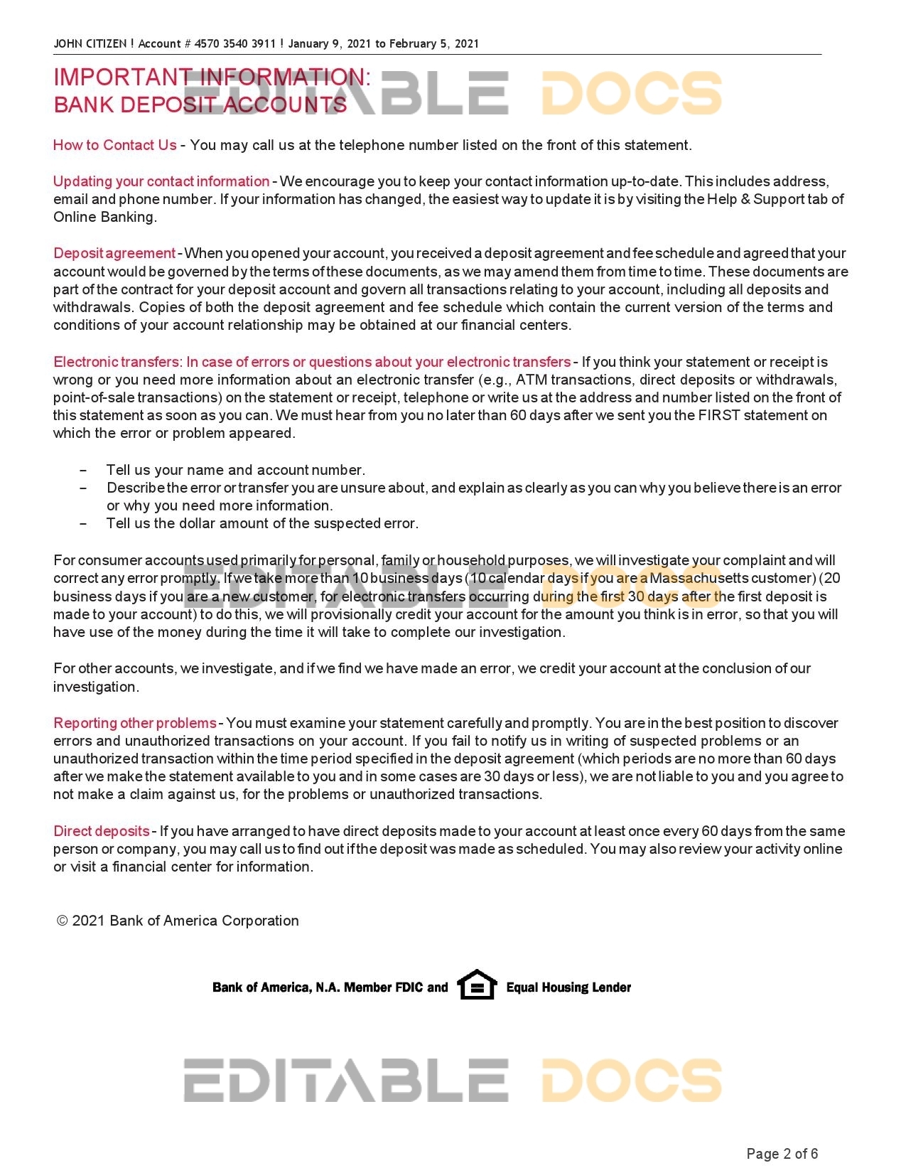 USA Bank of America bank statement reliable Word template