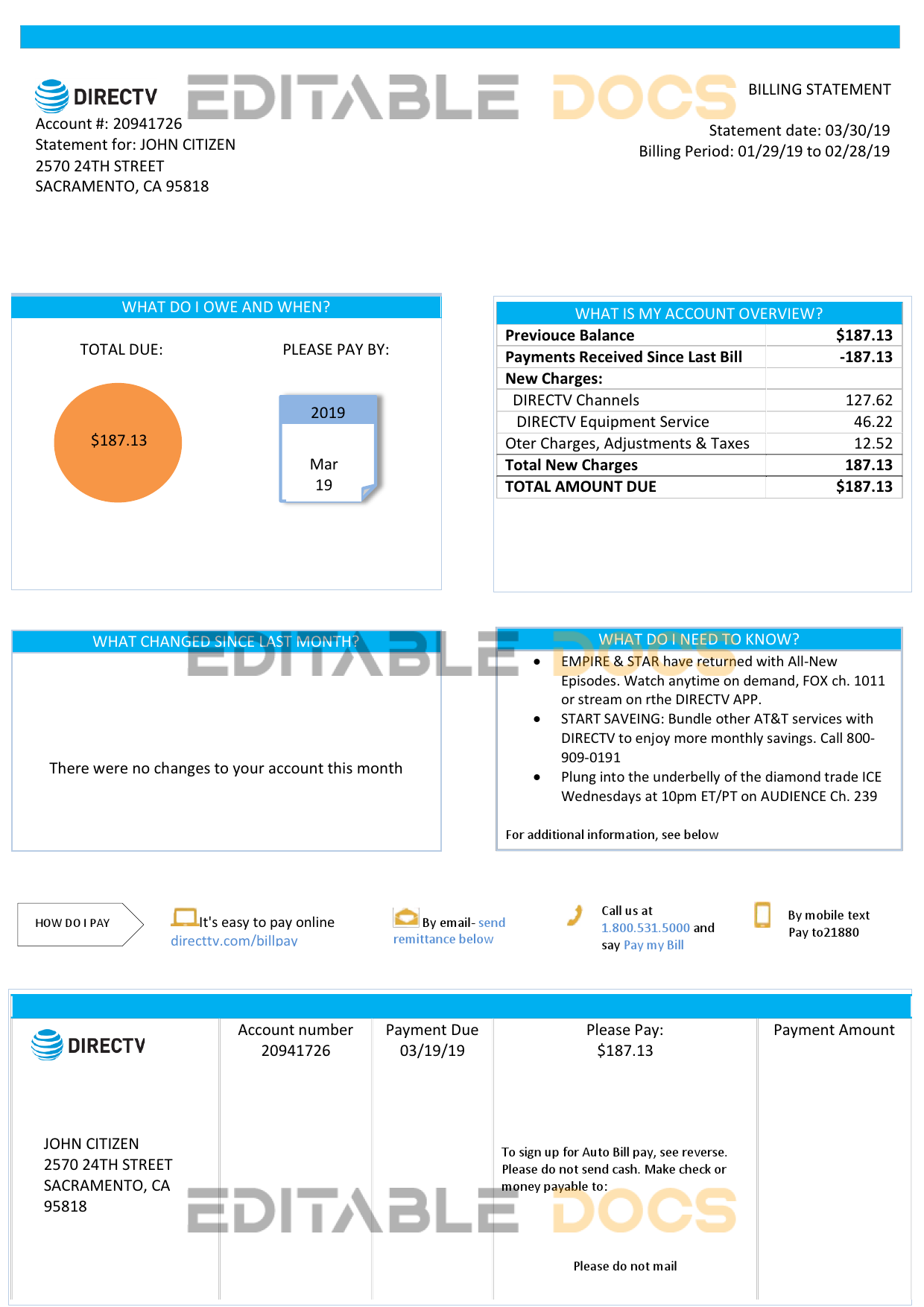 USA California Directv utility bill Word template. Fully editable Word template. High-quality template. Easy to customize, Layer based, fonts included. you can edit this template and put any name, address, license number, Id number, birth date, height, weight, expiration date, etc. This Word template is easy to Editing. To modify this Word template file you will need a Word editing software such as Microsoft Word. Be alert! Never use low-quality templates, your account may get suspended forever.