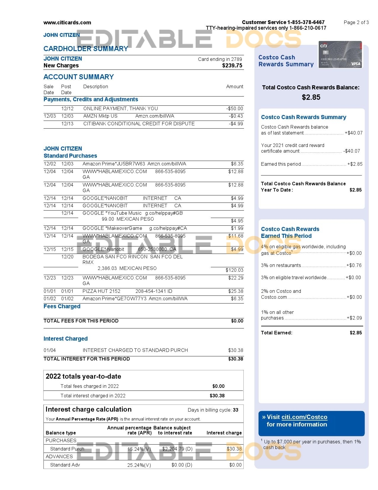 USA Costco Anywhere Visa Card by Citi bank statement Word template . Fully editable Word template. High quality template. Easy to customize, Layer based, fonts included. you can edit this template and put any name, address, license number, Id number, birth date, height, weight, expire date, change photos etc. This Word template is a easy to Editing.To modify this Word template file you will need a Word editing software such as Microsoft Word. Never used low quality template. Your account may be suspended.