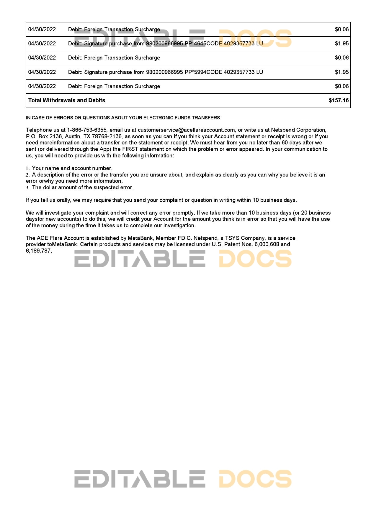 USA Metabank deposit account statement reliable Word template