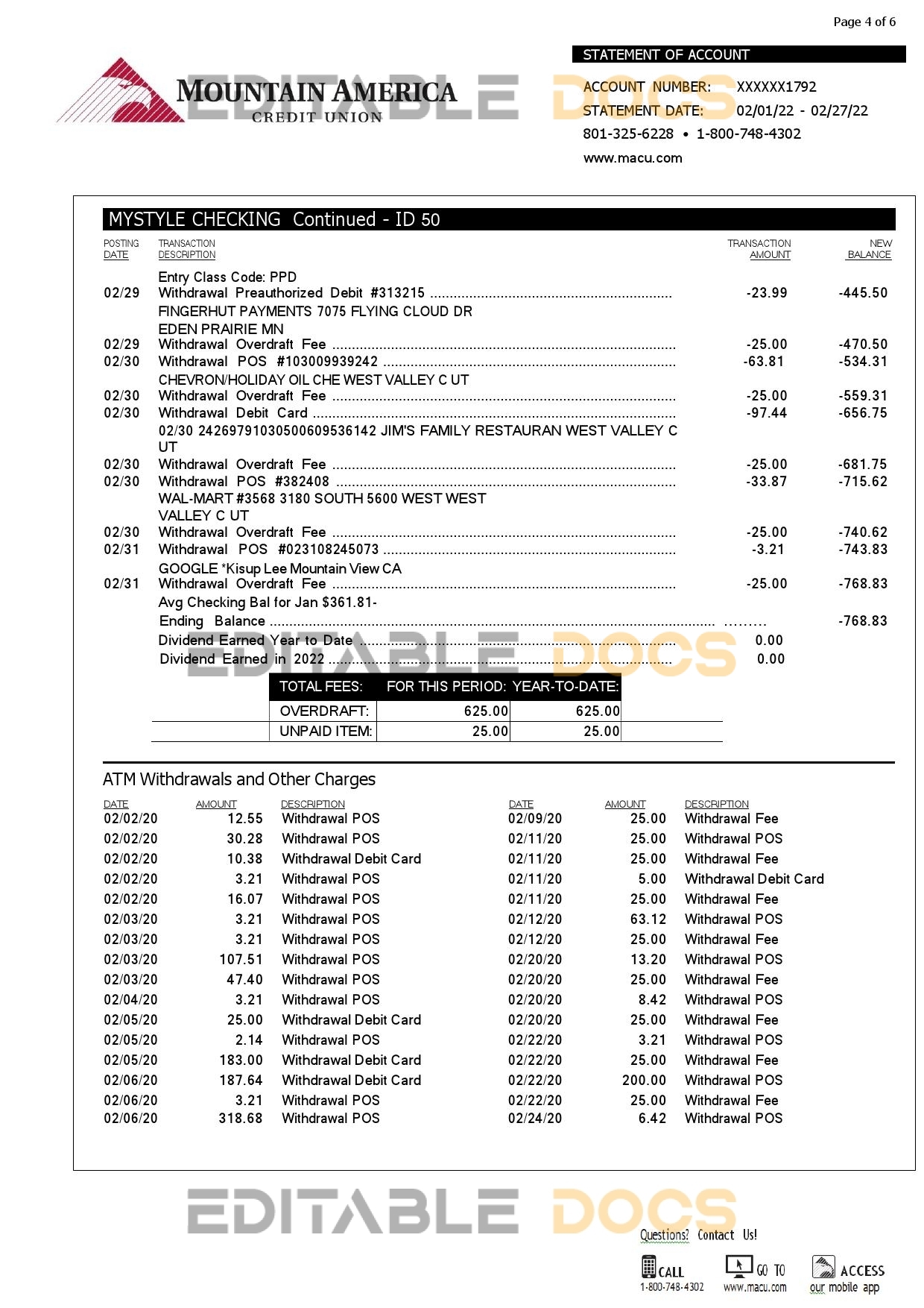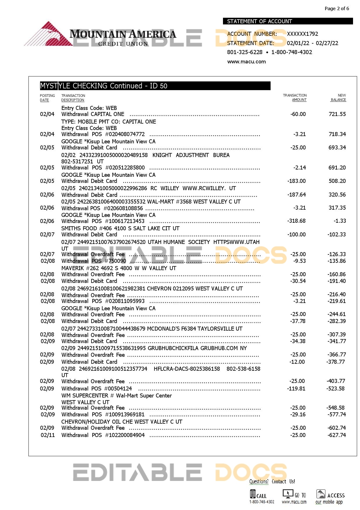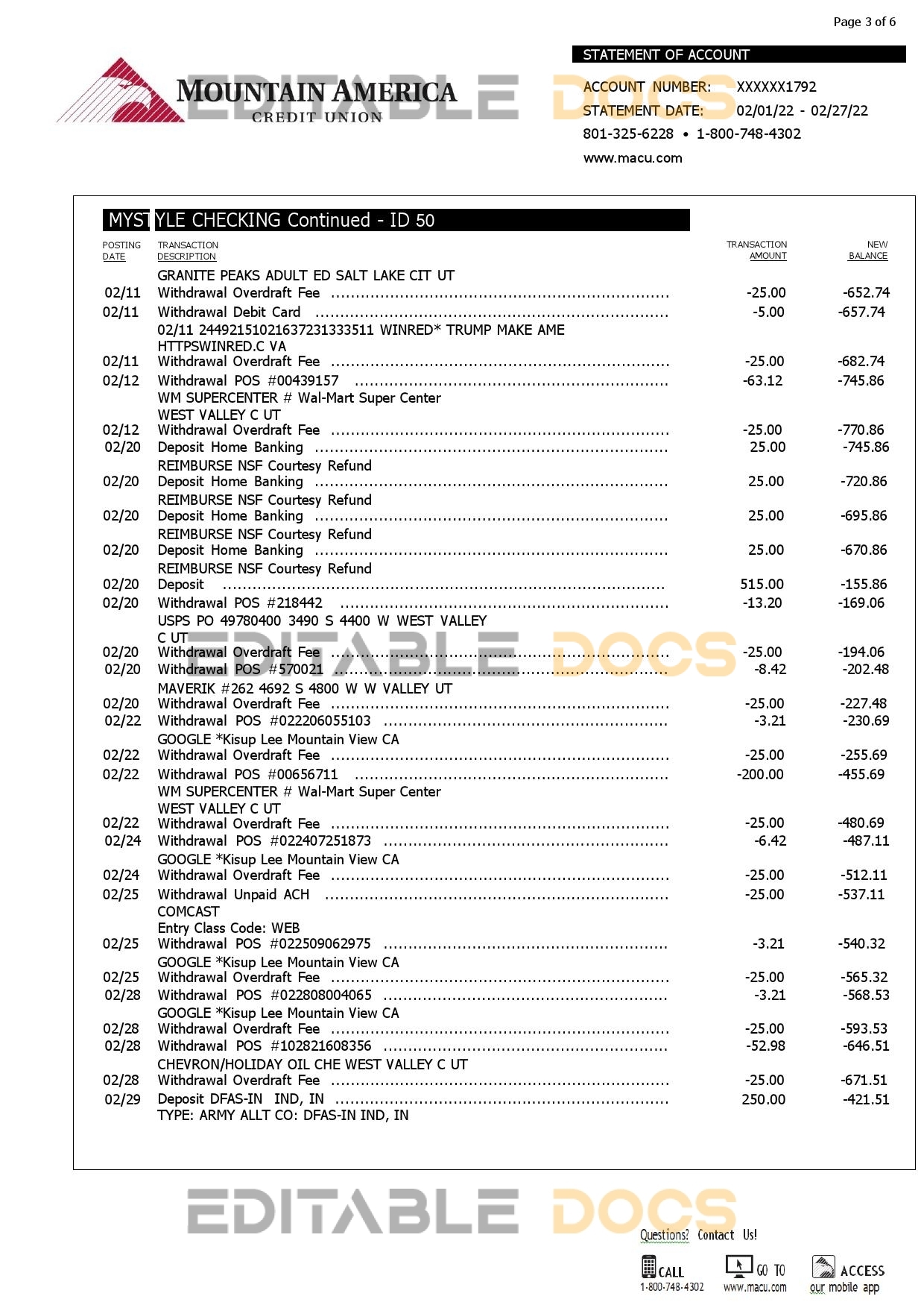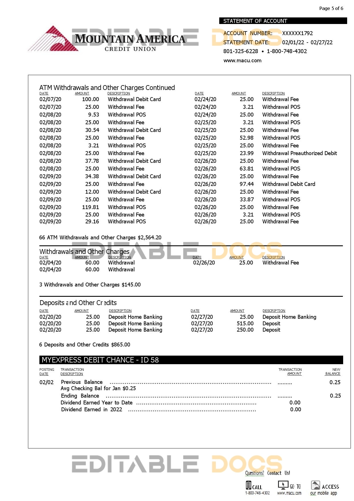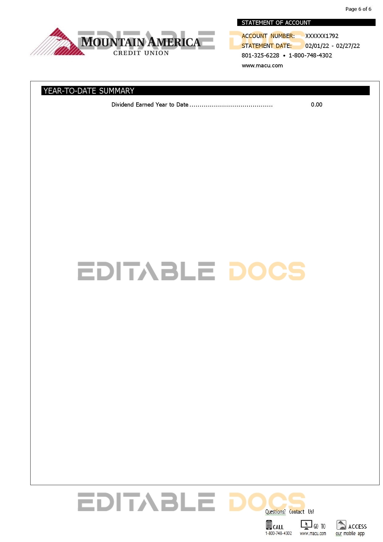 USA Mountain America Credit Union bank statement reliable Word template