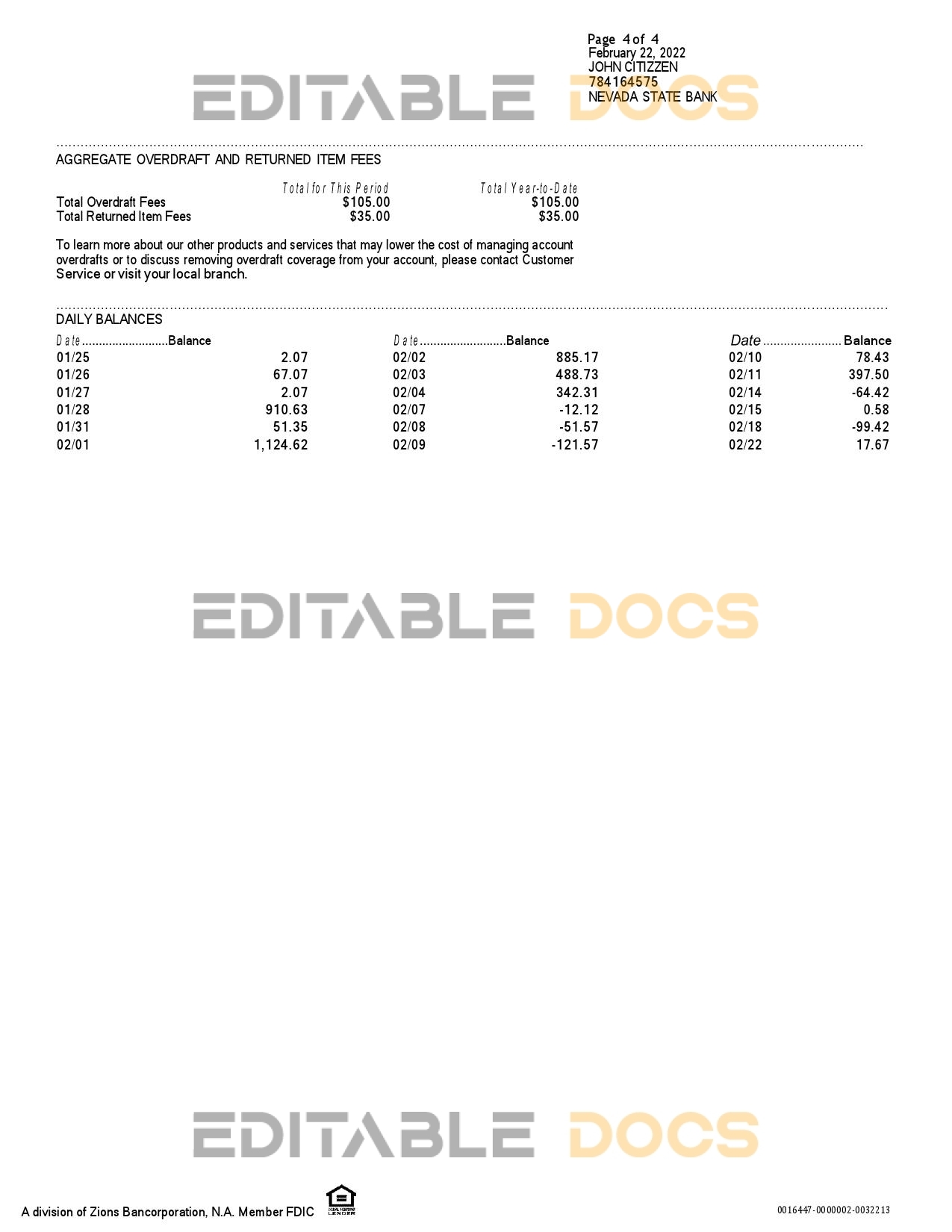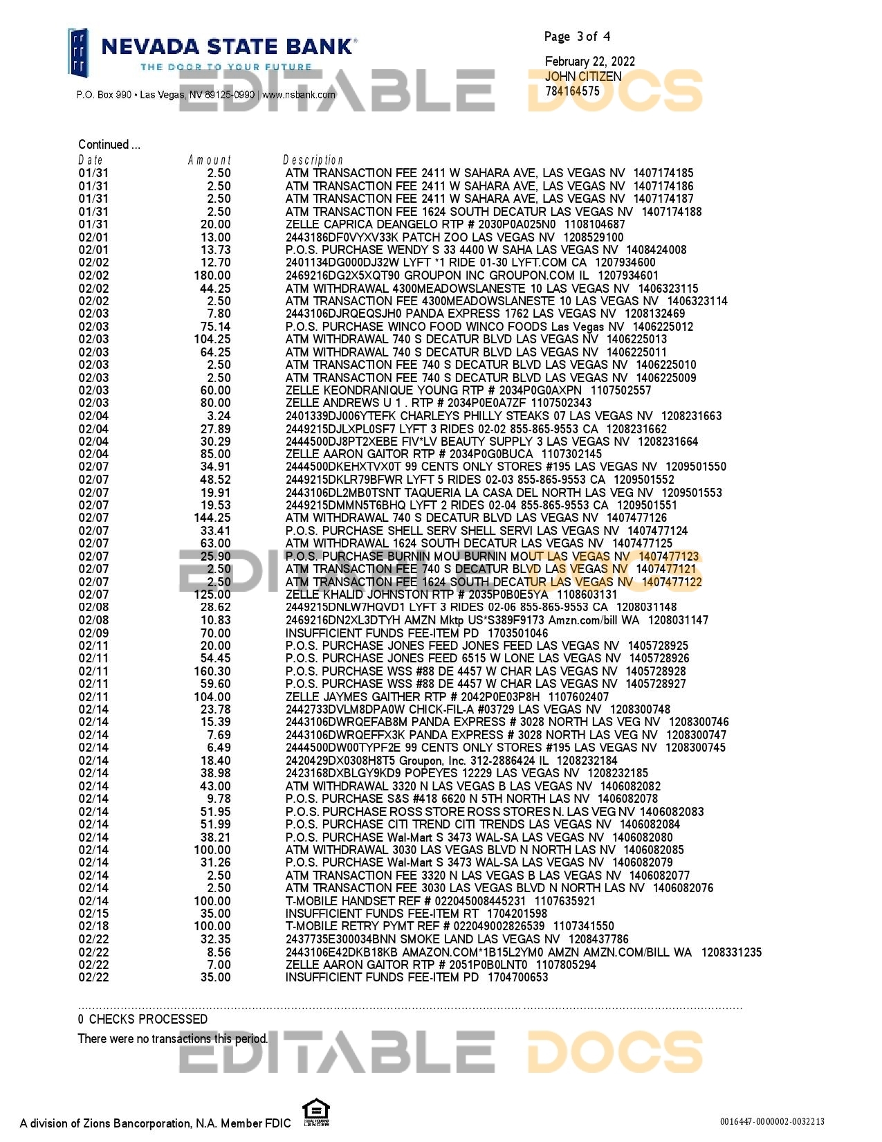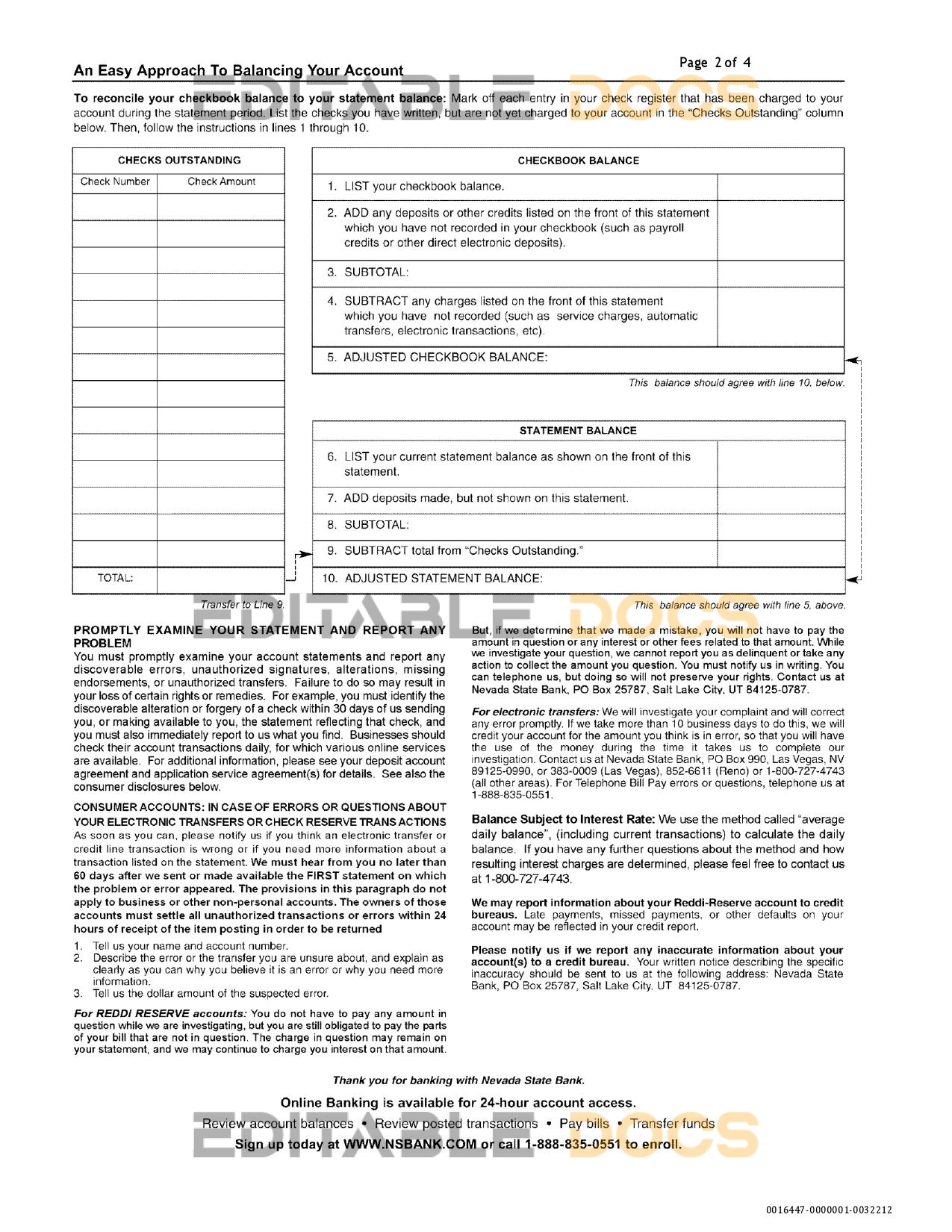 USA Nevada State Bank anytime checking statement reliable Word template