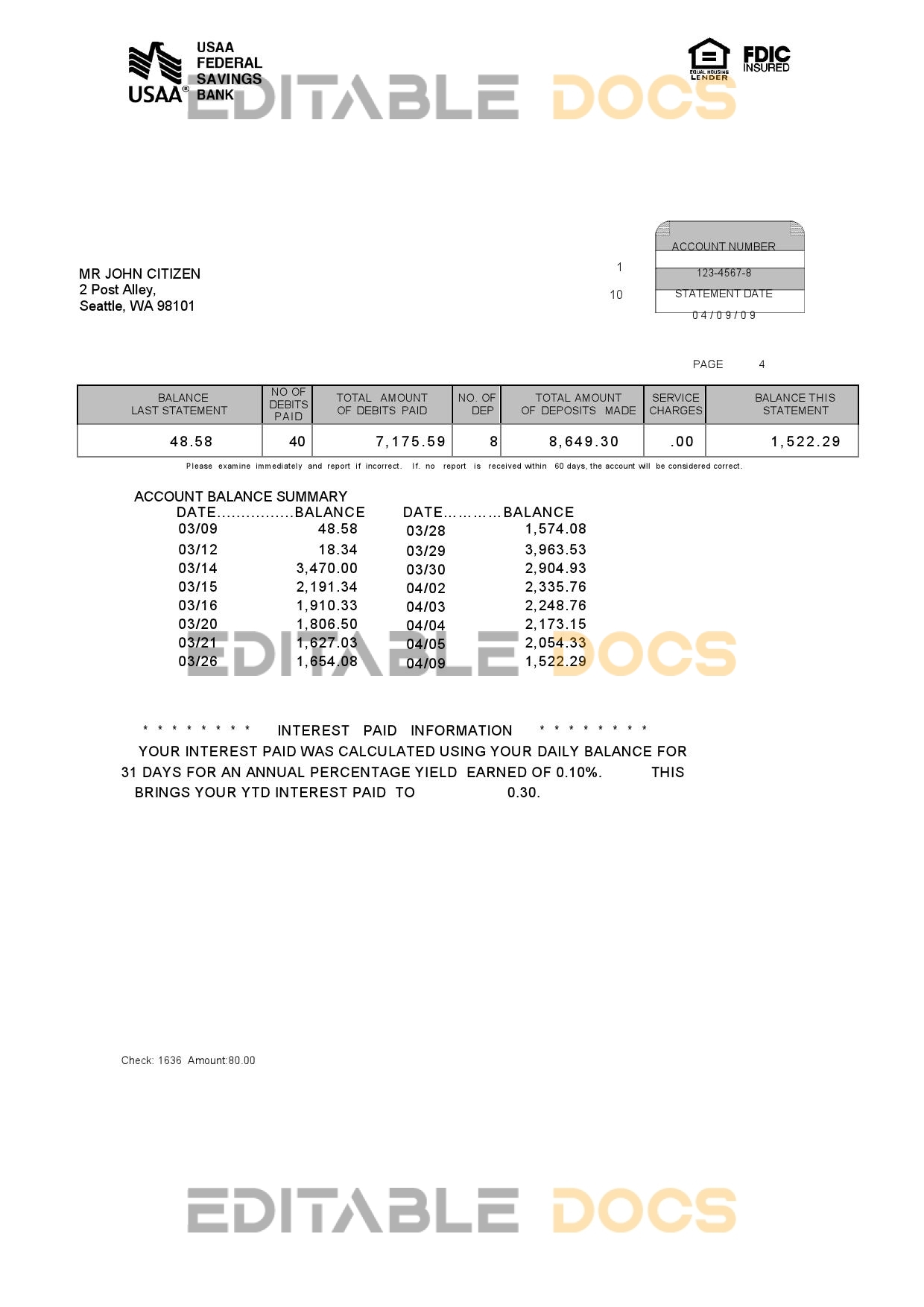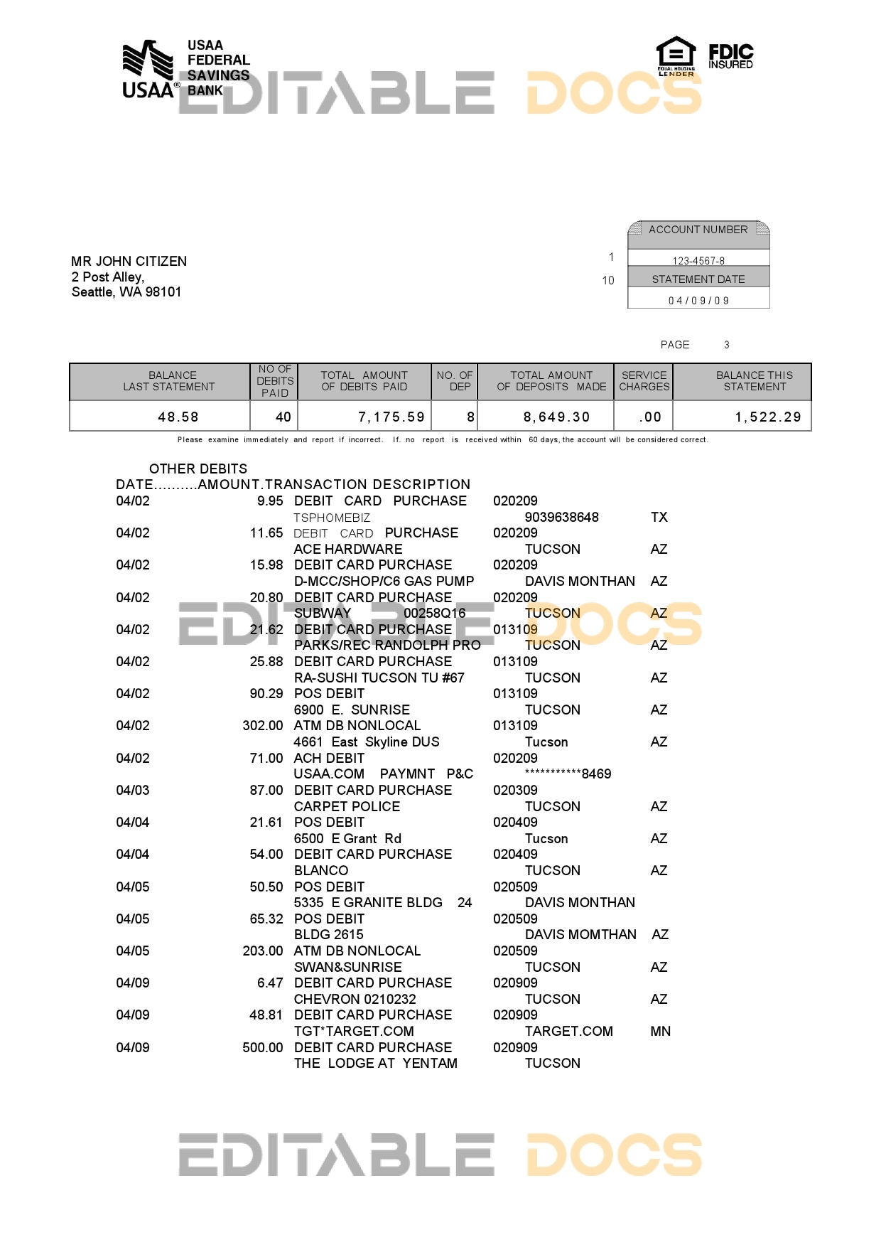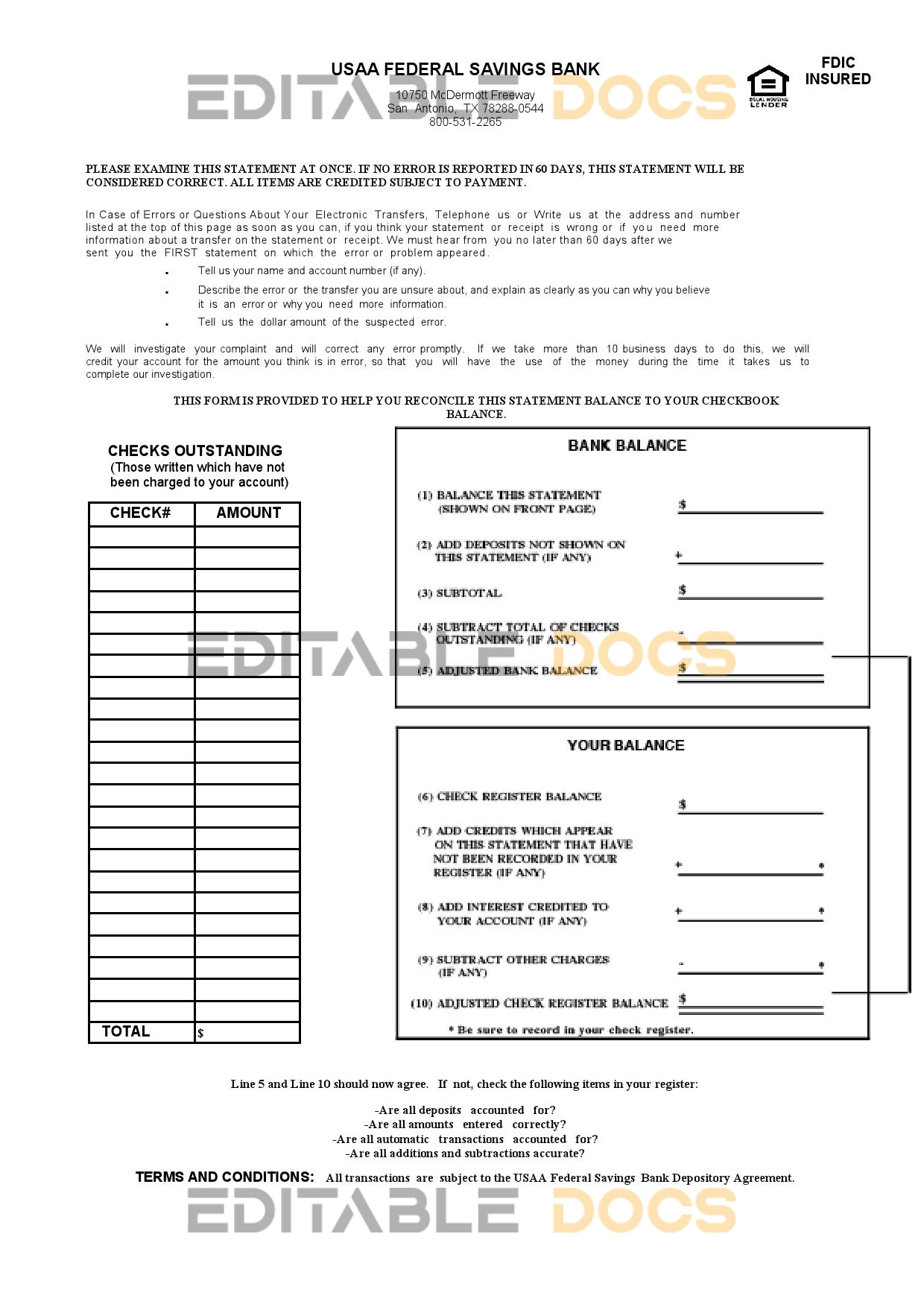 USA USAA bank statement reliable Word template
